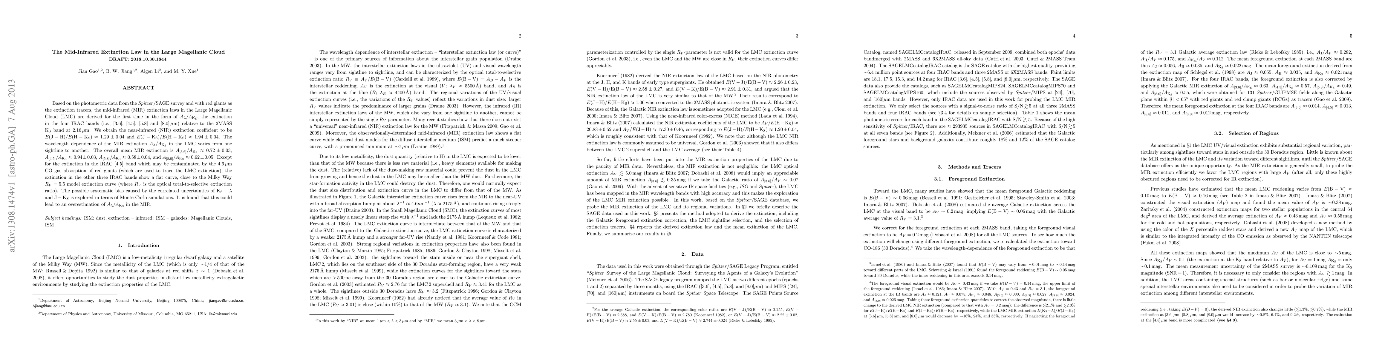 Researchers derived mid-infrared extinction laws in the Large Magellanic Cloud for the first time, finding a flat curve similar to the Milky Way Rv = 5.5 model in three IRAC bands, with some variation due to CO gas absorption.