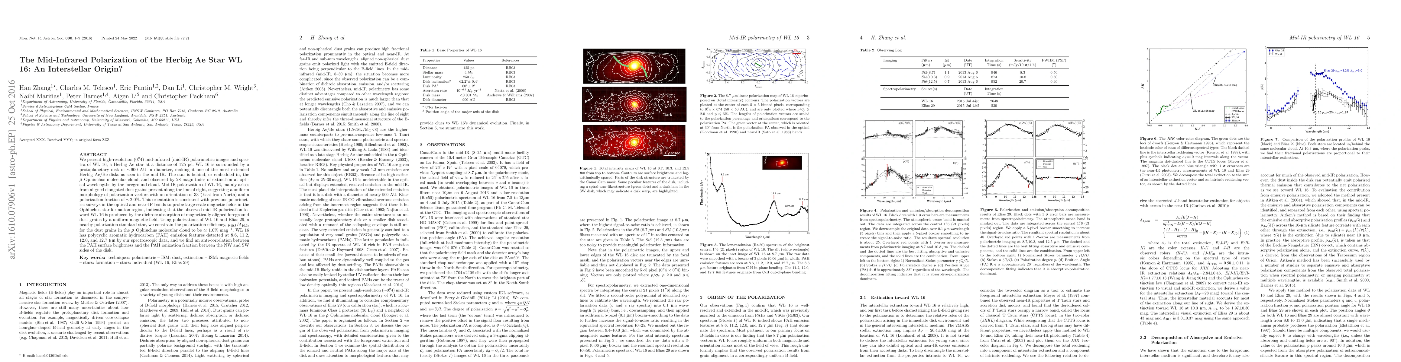 We present high-resolution (0".4) mid-infrared (mid-IR) polarimetric images and spectra of WL 16, a Herbig Ae star at a distance of 125 pc. WL 16 is surrounded by a protoplanetary disk of $\sim$ 900 AU in diameter, making it one of the most extended Herbig Ae/Be disks as seen in the mid-IR. The star is behind, or embedded in, the $\rho$ Ophiuchus molecular cloud, and obscured by 28 magnitudes of extinction at optical wavelengths by the foreground cloud. Mid-IR polarization of WL 16, mainly arises from aligned elongated dust grains present along the line of sight, suggesting a uniform morphology of polarization vectors with an orientation of 33\degr (East from North) and a polarization fraction of $\sim$ 2.0\%. This orientation is consistent with previous polarimetric surveys in the optical and near-IR bands to probe large-scale magnetic fields in the Ophiuchus star formation region, indicating that the observed mid-IR polarization toward WL 16 is produced by the dichroic absorption of magnetically aligned foreground dust grains by a uniform magnetic field. Using polarizations of WL 16 and Elias 29, a nearby polarization standard star, we constrain the polarization efficiency, \textit{$p_{10.3}/A_{10.3}$}, for the dust grains in the $\rho$ Ophiuchus molecular cloud to be $\sim$ 1.0\% mag$^{-1}$. WL 16 has polycyclic aromatic hydrocarbon (PAH) emission features detected at 8.6, 11.2, 12.0, and 12.7 $\mu$m by our spectroscopic data, and we find an anti-correlation between the PAH surface brightness and the PAH ionization fraction between the NW and SW sides of the disk.