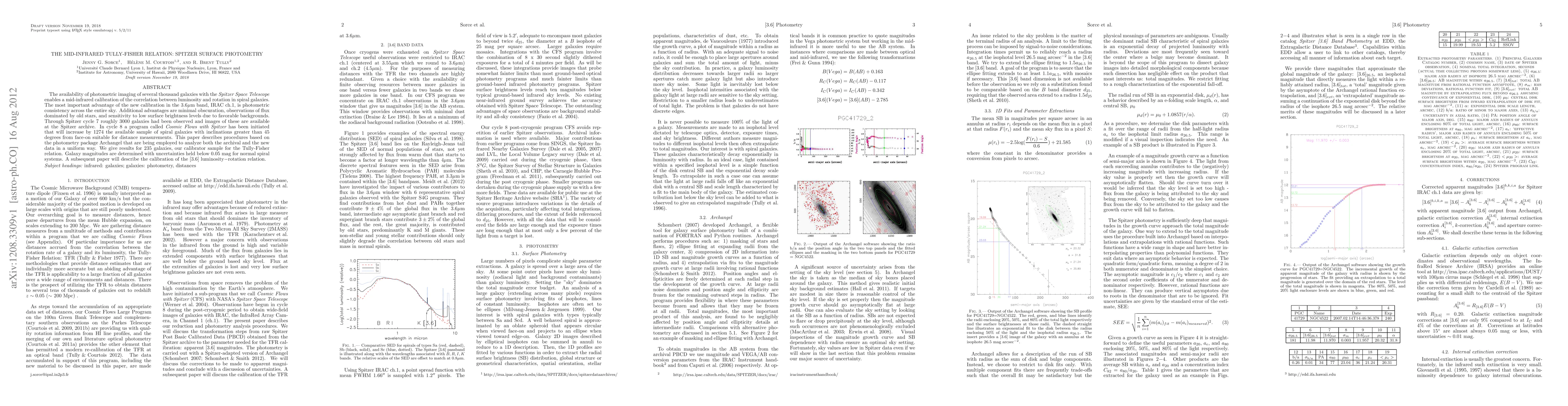 The availability of photometric imaging of several thousand galaxies with the Spitzer Space Telescope enables a mid-infrared calibration of the correlation between luminosity and rotation in spiral galaxies. The most important advantage of the new calibration in the 3.6 micron band, IRAC ch.1, is photometric consistency across the entire sky. Additional advantages are minimal obscuration, observations of flux dominated by old stars, and sensitivity to low surface brightness levels due to favorable backgrounds. Through Spitzer cycle 7 roughly 3000 galaxies had been observed and images of these are available at the Spitzer archive. In cycle 8 a program called Cosmic Flows with Spitzer has been initiated that will increase by 1274 the available sample of spiral galaxies with inclinations greater than 45 degrees from face-on suitable for distance measurements. This paper describes procedures based on the photometry package Archangel that are being employed to analyze both the archival and the new data in a uniform way. We give results for 235 galaxies, our calibrator sample for the Tully-Fisher relation. Galaxy magnitudes are determined with uncertainties held below 0.05 mag for normal spiral systems. A subsequent paper will describe the calibration of the [3.6] luminosity-rotation relation.