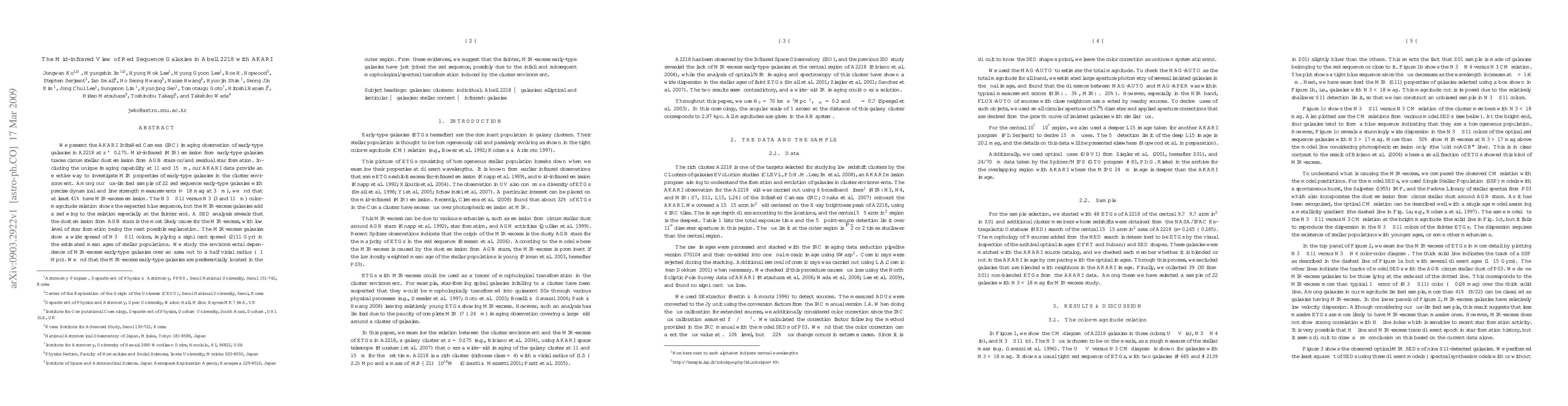 We present the {\it AKARI} InfraRed Camera (IRC) imaging observation of early-type galaxies in A2218 at z $\simeq$ 0.175. Mid-infrared (MIR) emission from early-type galaxies traces circumstellar dust emission from AGB stars or/and residual star formation. Including the unique imaging capability at 11 and 15 $\mu$m, our {\it AKARI} data provide an effective way to investigate MIR properties of early-type galaxies in the cluster environment. Among our flux-limited sample of 22 red sequence early-type galaxies with precise dynamical and line strength measurements ($<$ 18 mag at 3 $\mu m$), we find that at least 41% have MIR-excess emission. The $N3-S11$ versus $N3$ (3 and 11 $\mu$m) color-magnitude relation shows the expected blue sequence, but the MIR-excess galaxies add a red wing to the relation especially at the fainter end. A SED analysis reveals that the dust emission from AGB stars is the most likely cause for the MIR-excess, with low level of star formation being the next possible explanation. The MIR-excess galaxies show a wide spread of $N3-S11$ colors, implying a significant spread (2--11 Gyr) in the estimated mean ages of stellar populations. We study the environmental dependence of MIR-excess early-type galaxies over an area out to a half virial radius ($\sim$1 Mpc). We find that the MIR-excess early-type galaxies are preferentially located in the outer region. From these evidences, we suggest that the fainter, MIR-excess early-type galaxies have just joined the red sequence, possibly due to the infall and subsequent morphological/spectral transformation induced by the cluster environment.