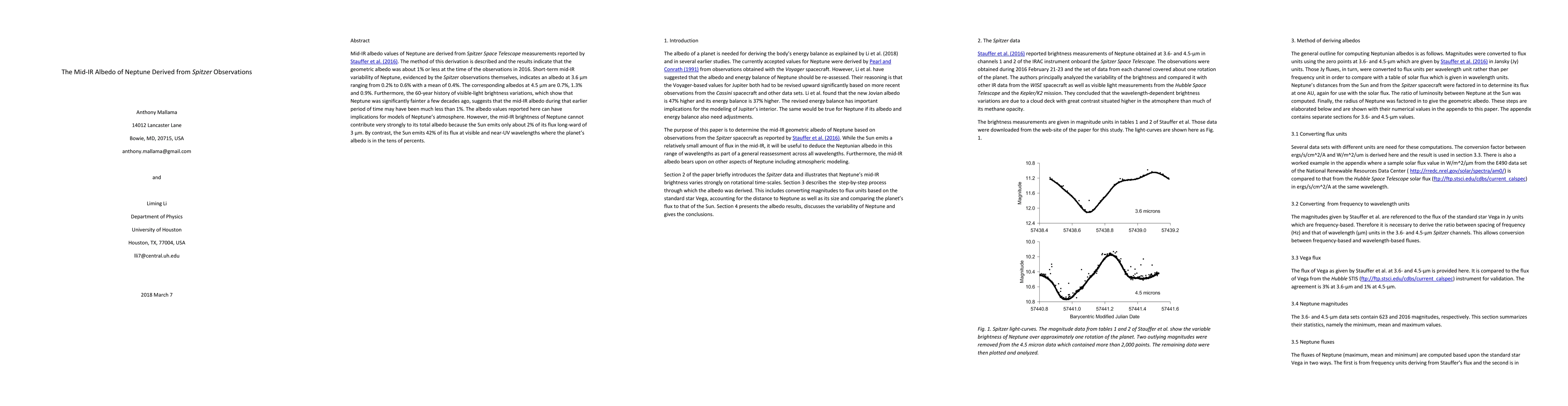 Mid-IR albedo values of Neptune are derived from Spitzer Space Telescope measurements reported by Stauffer et al. (2016). The method of this derivation is described and the results indicate that the geometric albedo was about 1% or less at the time of the observations in 2016. Short-term mid-IR variability of Neptune, evidenced by the Spitzer observations themselves, indicates an albedo at 3.6 microns ranging from 0.2% to 0.6% with a mean of 0.4%. The corresponding albedos at 4.5 microns are 0.7%, 1.3% and 0.9%. Furthermore, the 60-year history of visible-light brightness variations, which show that Neptune was significantly fainter a few decades ago, suggests that the mid-IR albedo during that earlier period of time may have been much less than 1%. The albedo values reported here can have implications for models of Neptune's atmosphere. However, the mid-IR brightness of Neptune cannot contribute very strongly to its total albedo because the Sun emits only about 2% of its flux long-ward of 3 micron. By contrast, the Sun emits 42% of its flux at visible and near-UV wavelengths where the planet's albedo is in the tens of percents.
