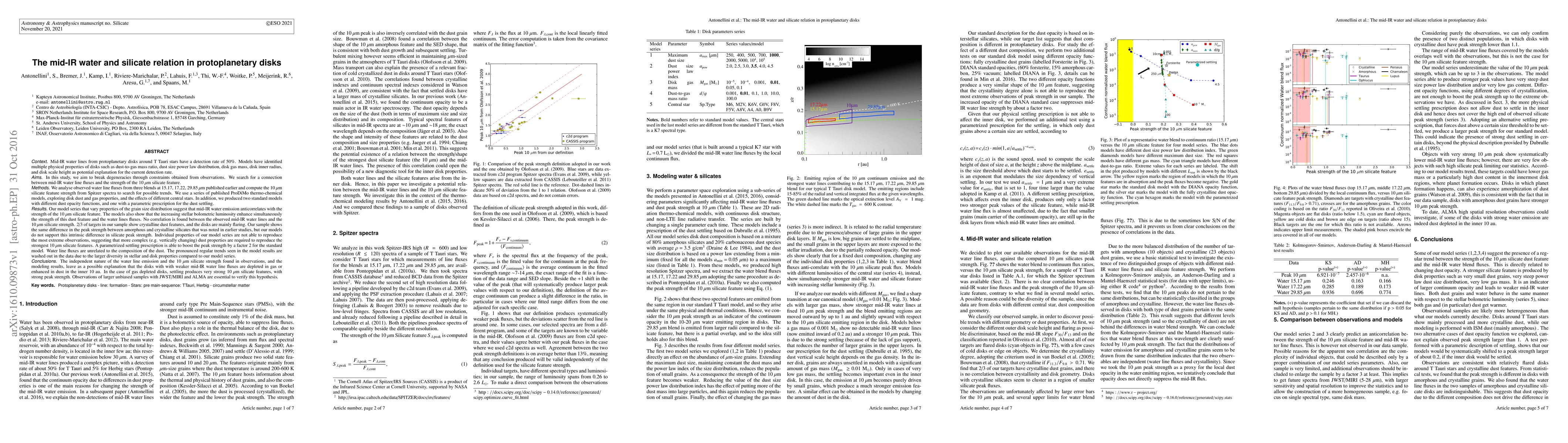 Mid-IR water lines from protoplanetary disks around T Tauri stars have a detection rate of 50\%. Models have identified multiple physical properties of disks such as dust-to-gas mass ratio, dust size power law distribution, disk gas mass, disk inner radius, and disk scale height as potential explanation for the current detection rate. We search for a connection between mid-IR water line fluxes and the strength of the 10~$\mu$m silicate feature. We analyse observed water line fluxes from three blends and compute the 10~$\mu$m silicate feature strength from Spitzer spectra. We use a series of published models, exploring disk dust and gas properties, and the effects of different stars. The models also show that the increasing stellar luminosity enhance simultaneously the strength of this dust feature and the water lines fluxes. No correlation is found between the observed mid-IR water lines and the 10~$\mu$m silicate. Our sample shows the same difference in the peak strength between amorphous and crystalline silicates that was noted in earlier studies, but our models do not support this intrinsic difference in silicate peak strength. Individual properties of our model series are not able to reproduce the most extreme observations, suggesting that more complex dust properties are required. A parametrized settling prescription is able to boost the peak strength by a factor 2 for the standard model. Water line fluxes are unrelated to the composition of the dust. The pronounced regular trends seen in the model results are washed out in the data due to the larger diversity in stellar and disk properties compared to our model series. The disks with with weaker mid-IR water line fluxes are depleted in gas or enhanced in dust in the inner 10~au. In the case of gas depleted disks, settling produces very strong 10~$\mu$m silicate features, with strong peak strength.