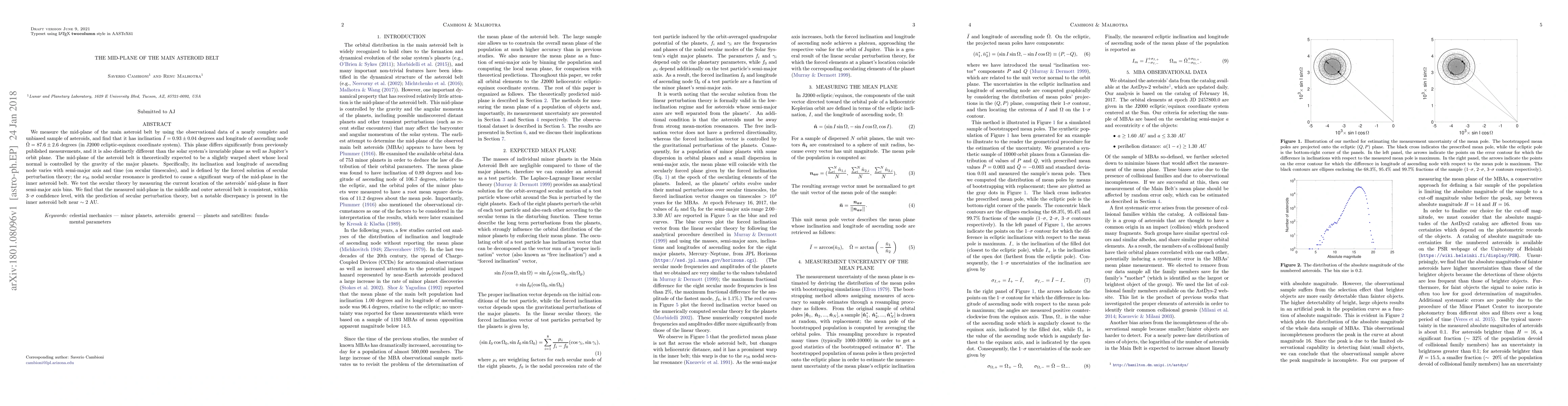 We measure the mid-plane of the main asteroid belt by using the observational data of a nearly complete and unbiased sample of asteroids, and find that it has inclination $\bar{I}=0.93\pm0.04$ degrees and longitude of ascending node $\bar{\Omega}=87.6\pm2.6$ degrees (in J2000 ecliptic-equinox coordinate system). This plane differs significantly from previously published measurements, and it is also distinctly different than the solar system's invariable plane as well as Jupiter's orbit plane. The mid-plane of the asteroid belt is theoretically expected to be a slightly warped sheet whose local normal is controlled by the gravity of the major planets. Specifically, its inclination and longitude of ascending node varies with semi-major axis and time (on secular timescales), and is defined by the forced solution of secular perturbation theory; the $\nu_{16}$ nodal secular resonance is predicted to cause a significant warp of the mid-plane in the inner asteroid belt. We test the secular theory by measuring the current location of the asteroids' mid-plane in finer semi-major axis bins. We find that the measured mid-plane in the middle and outer asteroid belt is consistent, within 3--$\sigma$ confidence level, with the prediction of secular perturbation theory, but a notable discrepancy is present in the inner asteroid belt near $\sim2$ AU.