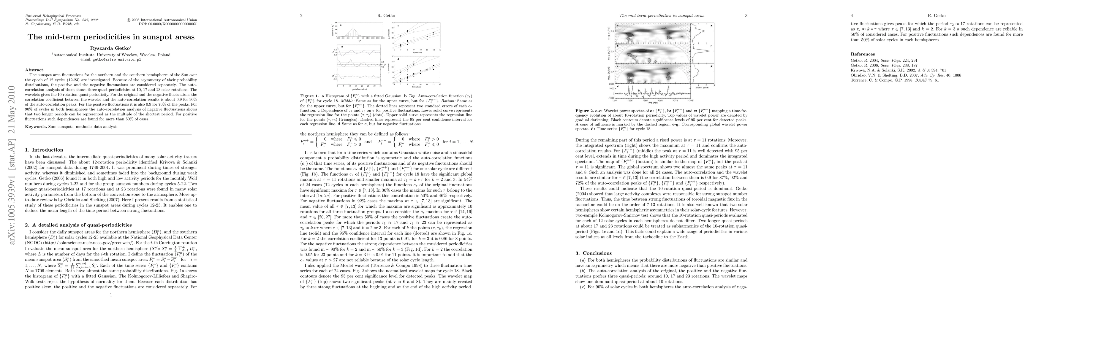 The sunspot area fluctuations for the northern and the southern hemispheres of the Sun over the epoch of 12 cycles (12-23) are investigated. Because of the asymmetry of their probability distributions, the positive and the negative fluctuations are considered separately. The auto-correlation analysis of them shows three quasi-periodicities at 10, 17 and 23 solar rotations. The wavelets gives the 10-rotation quasi-periodicity. For the original and the negative fluctuations the correlation coefficient between the wavelet and the auto-correlation results is about 0.9 for 90% of the auto-correlation peaks. For the positive fluctuations it is also 0.9 for 70% of the peaks. For 90% of cycles in both hemispheres the auto-correlation analysis of negative fluctuations shows that two longer periods can be represented as the multiple of the shortest period. For positive fluctuations such dependences are found for more than 50% of cases.