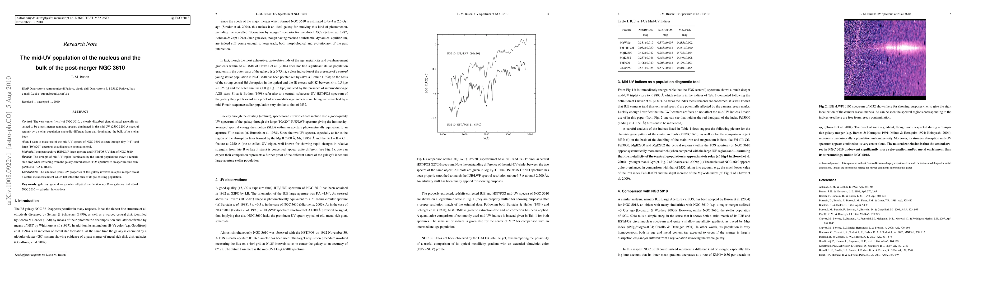 The very center of NGC~3610, a clearly disturbed giant elliptical generally assumed to be a post-merger remnant, appears dominated in the mid-UV (2500-3200 A spectral region) by a stellar population markedly different from that dominating the bulk of its stellar body. I want here to make use of the mid-UV spectra of NGC~3610 as seen through tiny ($\sim$1") and large (10"$\times$20") apertures as a diagnostic population tool. I compare archive IUE/LWP large aperture and HST/FOS UV data of NGC 3610. The strength of mid-UV triplet (dominated by the turnoff population) shows a remarkable drop when switching from the galaxy central arcsec (FOS aperture) to an aperture size comparable to $\sim$0.5 r$_e$ (IUE). The sub-arsec (mid)-UV properties of this galaxy involved in a past merger reveal a central metal enrichment which left intact the bulk of its pre-existing population.