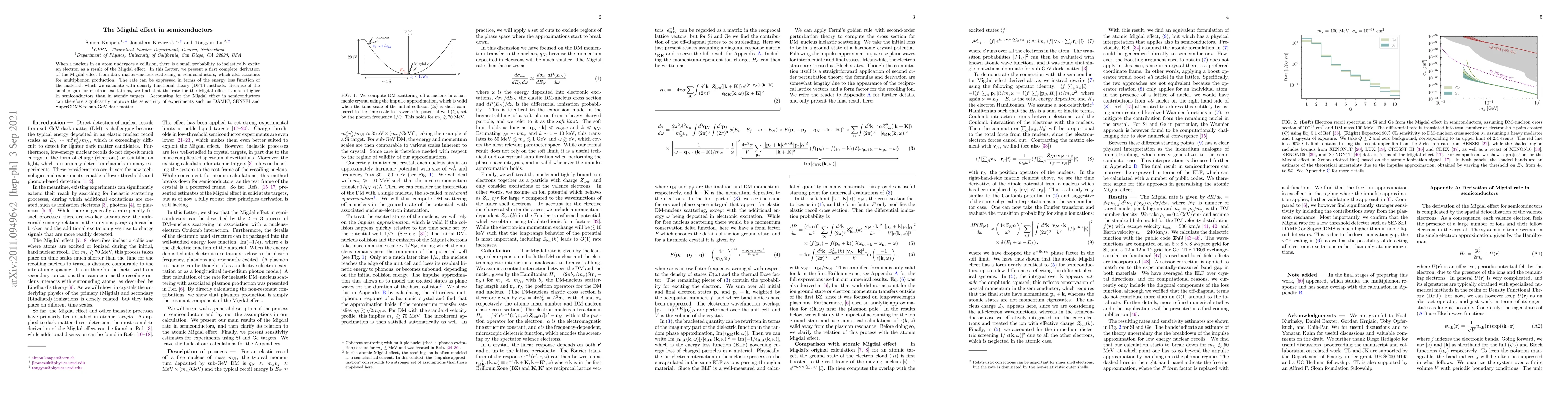This paper derives the Migdal effect in semiconductors, showing that it occurs at a much higher rate due to the smaller energy gap for electron excitations compared to atomic targets. The study uses density functional theory to calculate the energy loss function, enhancing the sensitivity of dark matter detection experiments.