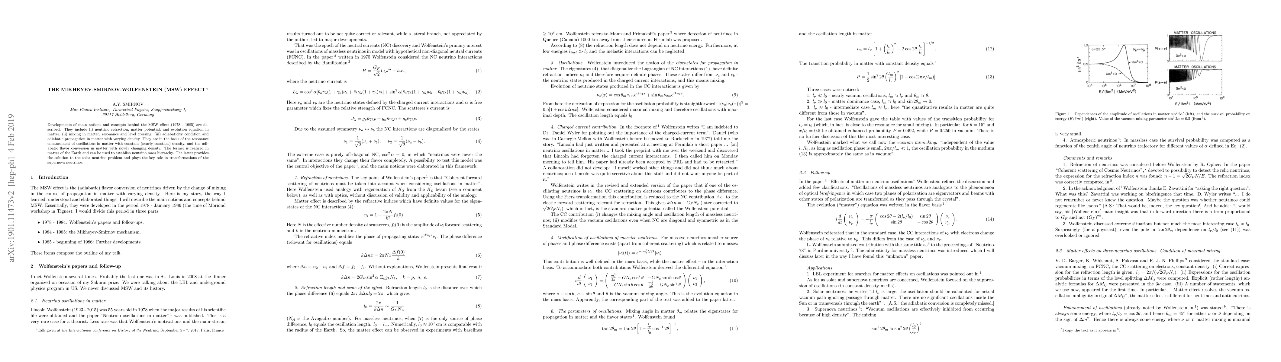 The paper outlines the development of the MSW effect, detailing neutrino refraction, matter potential, and evolution equations, and discusses mixing, resonance, and adiabaticity conditions in varying matter densities. It highlights the MSW effect's role in solving the solar neutrino problem and establishing neutrino mass hierarchy.