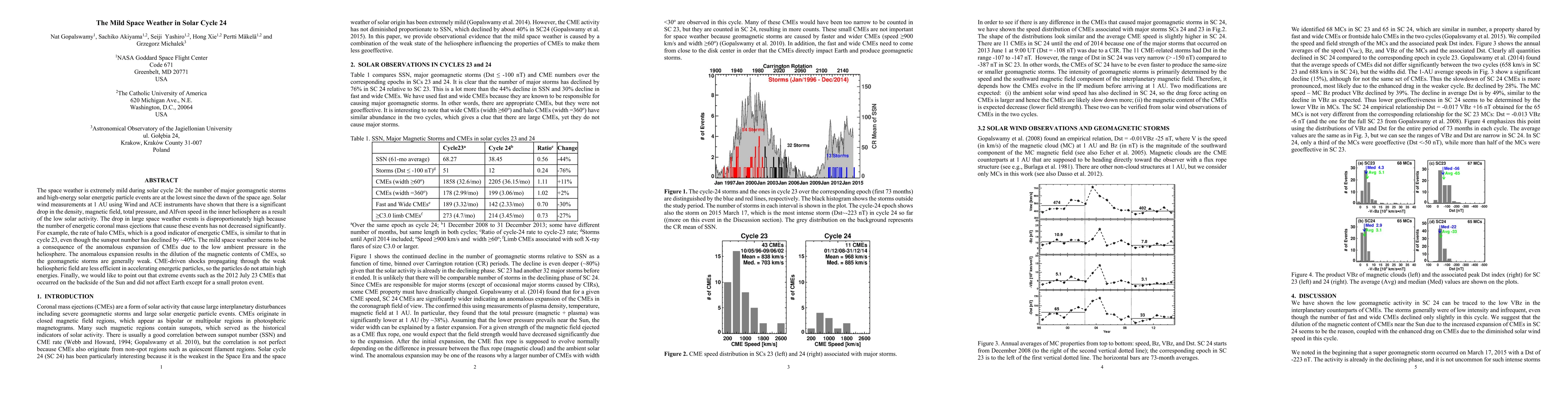 The mild space weather during solar cycle 24 is characterized by a significant drop in geomagnetic storms and high-energy particle events due to low solar activity, despite a similar rate of coronal mass ejections compared to cycle 23. The anomalous expansion of these ejections in a low-pressure heliosphere results in weaker geomagnetic storms and less efficient particle acceleration.