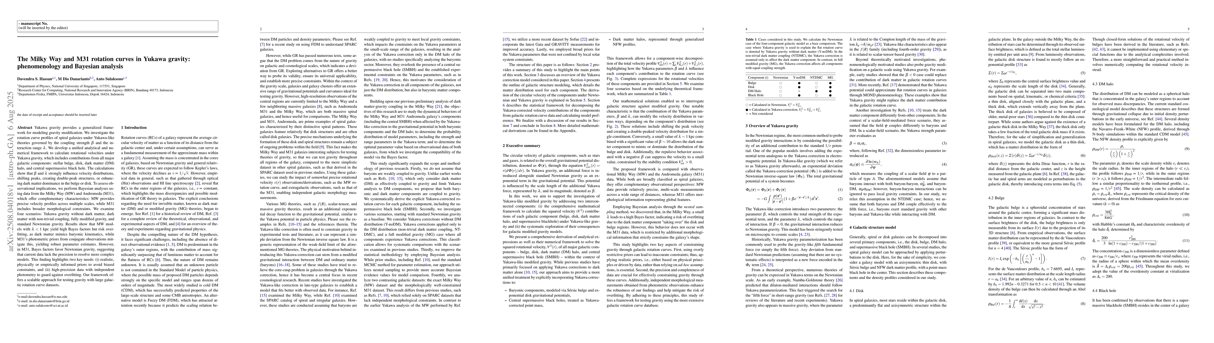 Yukawa gravity provides a generalized framework for modeling gravity modification. We investigate the rotation curve profiles of spiral galaxies under Yukawa-like theories governed by the coupling strength $\beta$ and the interaction range $\lambda$. We develop a unified analytical and numerical framework to calculate rotational velocities under Yukawa gravity, which includes contributions from all major galactic components: stellar bulge, disk, dark matter (DM) halo, and central supermassive black hole. The calculations show that $\beta$ and $\lambda$ strongly influence velocity distributions, shifting peaks, creating double-peak structures, or enhancing dark matter dominance in the bulge or disk. To assess observational implications, we perform Bayesian analyses using data from the Milky Way (MW) and Andromeda (M31), which offer complementary characteristics: MW provides precise velocity profiles across multiple scales, while M31 includes broader morphological constraints. We examine four scenarios: Yukawa gravity without dark matter, dark matter with non-trivial coupling, fully modified gravity, and standard Newtonian gravity. Results show that MW models with $\lambda < 1$ kpc yield high Bayes factors but risk overfitting, as dark matter mimics baryonic kinematics, while M31's photometric priors from conjugate observations mitigate this, yielding robust parameter estimates. However, in M31, Bayes factors favor Newtonian gravity, suggesting that current data lack the precision to resolve more complex models. This finding highlights two key needs: (i) realistic, physically or empirically informed priors to avoid biased constraints, and (ii) high-precision data with independent photometry to guard against overfitting. Our framework offers a scalable approach for testing gravity with large galactic rotation curve datasets.