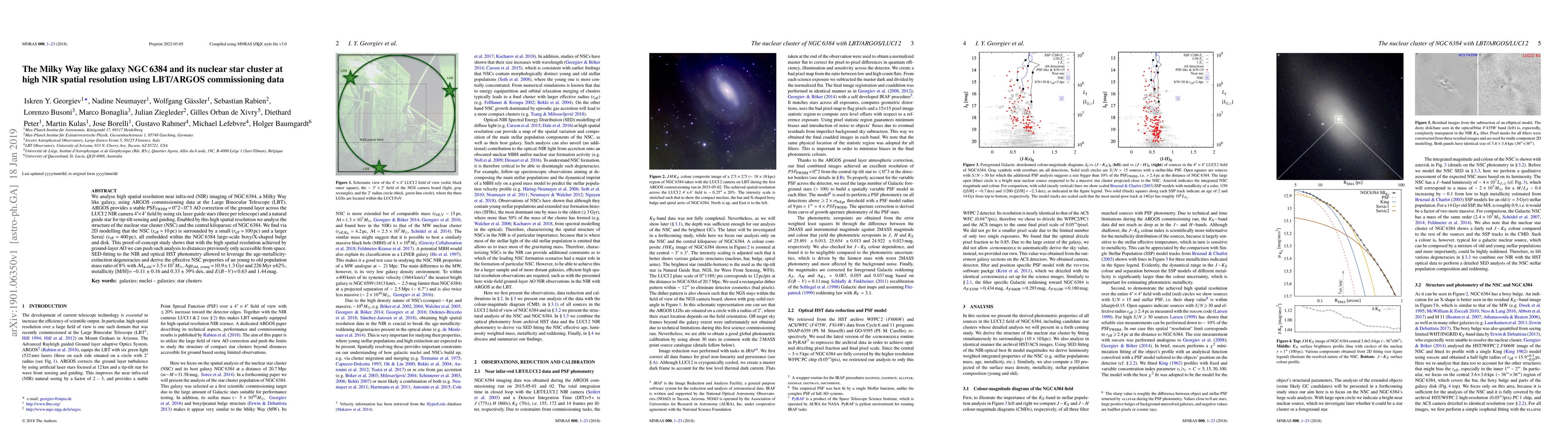 We analyse high spatial resolution near infra-red (NIR) imaging of NGC6384, a Milky Way like galaxy, using ARGOS commissioning data at the Large Binocular Telescope (LBT). ARGOS provides a stable PSF$_{\rm FWHM}\!=\!0.2"\!-\!0.3"$ AO correction of the ground layer across the LUCI2 NIR camera $4'\!\times4'$ field by using six laser guide stars (three per telescope) and a natural guide star for tip-tilt sensing and guiding. Enabled by this high spatial resolution we analyse the structure of the nuclear star cluster (NSC) and the central kiloparsec of NGC6384. We find via 2D modelling that the NSC ($r_{\rm eff}\!\simeq\!10$pc) is surrounded by a small ($r_{\rm eff}\!\simeq\!100$pc) and a larger Sersi\'c ($r_{\rm eff}\!\simeq\!400$pc), all embedded within the NGC\,6384 large-scale boxy/X-shaped bulge and disk. This proof-of-concept study shows that with the high spatial resolution achieved by ground-layer AO we can push such analysis to distances previously only accessible from space. SED-fitting to the NIR and optical HST photometry allowed to leverage the age-metallicity-extinction degeneracies and derive the effective NSC properties of an young to old population mass ratio of $8\%$ with ${\cal M}_{\rm\star,old}\!\simeq\!3.5\times10^7M_\odot$, Age$_{\rm old,\ young}\!=\!10.9\pm1.3$Gyr and 226\,Myr $\pm62\%$, metallicity [M/H]$=\!-0.11\pm0.16$ and $0.33\pm39\%$dex, and $E(B\!-\!V)\!=\!0.63$ and 1.44mag.