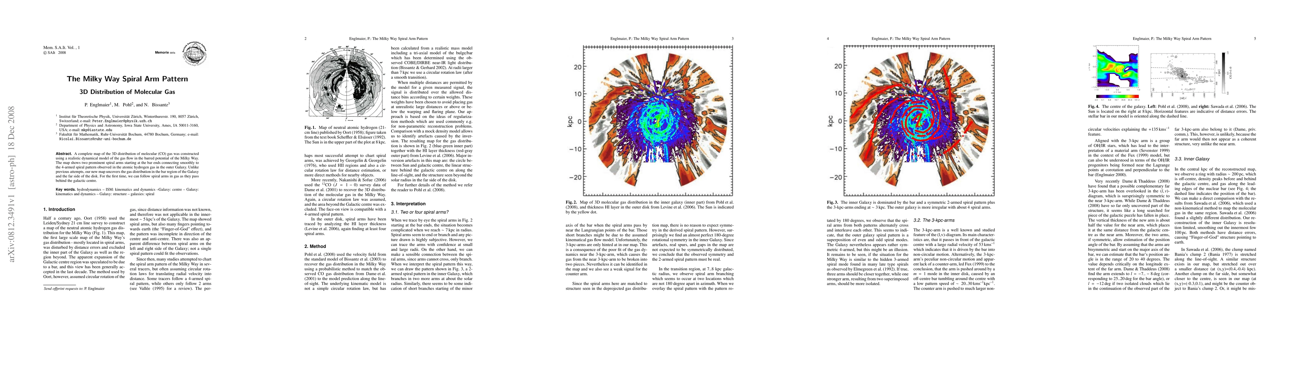 A complete map of the 3D distribution of molecular (CO) gas was constructed using a realistic dynamical model of the gas flow in the barred potential of the Milky Way. The map shows two prominent spiral arms starting at the bar ends connecting smoothly to the 4-armed spiral pattern observed in the atomic hydrogen gas in the outer Galaxy. Unlike previous attempts, our new map uncovers the gas distribution in the bar region of the Galaxy and the far side of the disk. For the first time, we can follow spiral arms in gas as they pass behind the galactic centre.