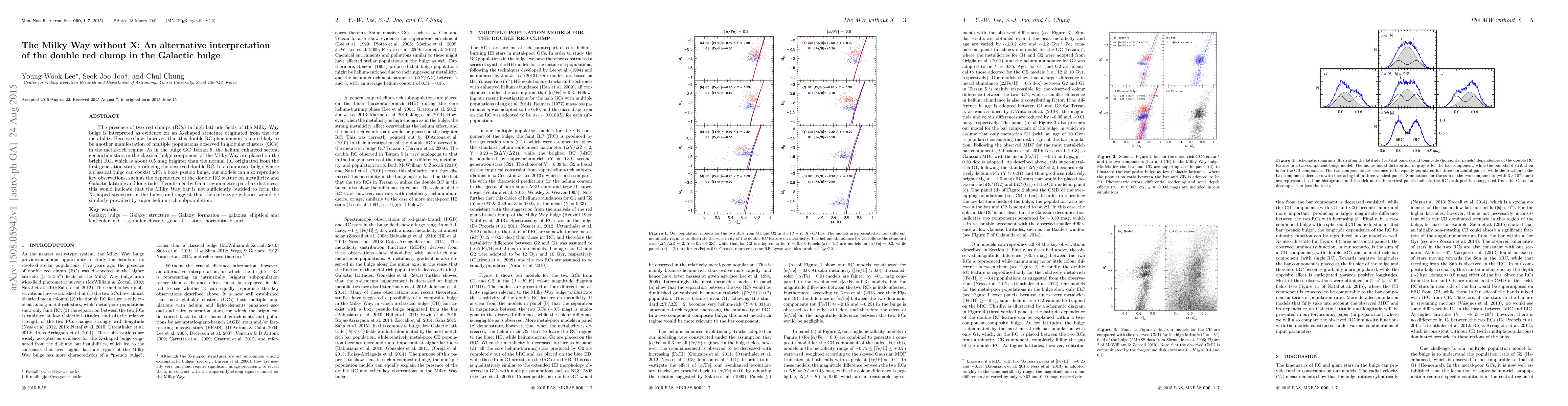 This paper challenges the interpretation of the double red clump in the Milky Way's Galactic bulge as evidence for an X-shaped bar structure, proposing instead that it results from helium-enhanced second-generation stars in the classical bulge. This alternative explanation aligns with the presence of multiple populations in globular clusters and could imply a different structural configuration for the Milky Way.