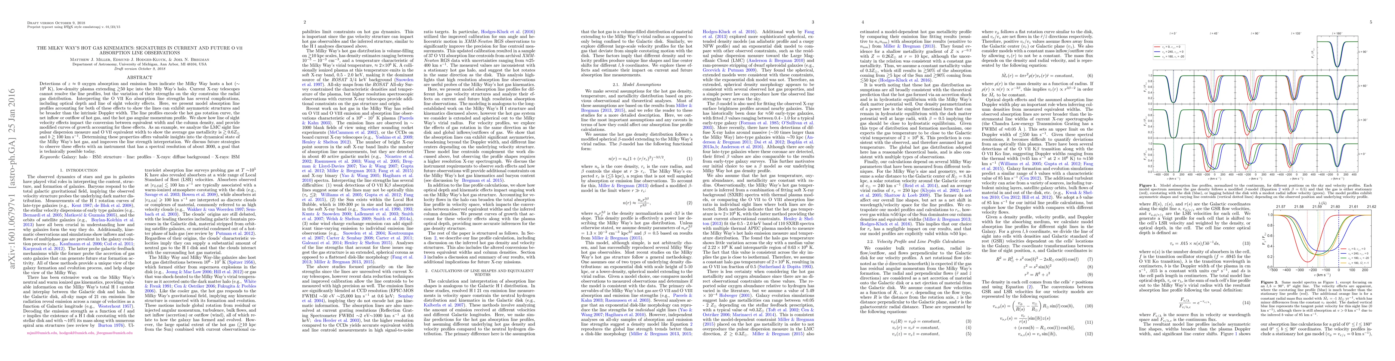 This paper models the kinematics of the Milky Way's hot gas using OVII absorption lines, revealing asymmetric structures and broader profiles due to optical depth and velocity effects. It provides insights into the gas's rotational dynamics, inflow/outflow, and metallicity, and discusses future observations with improved spectral resolution.