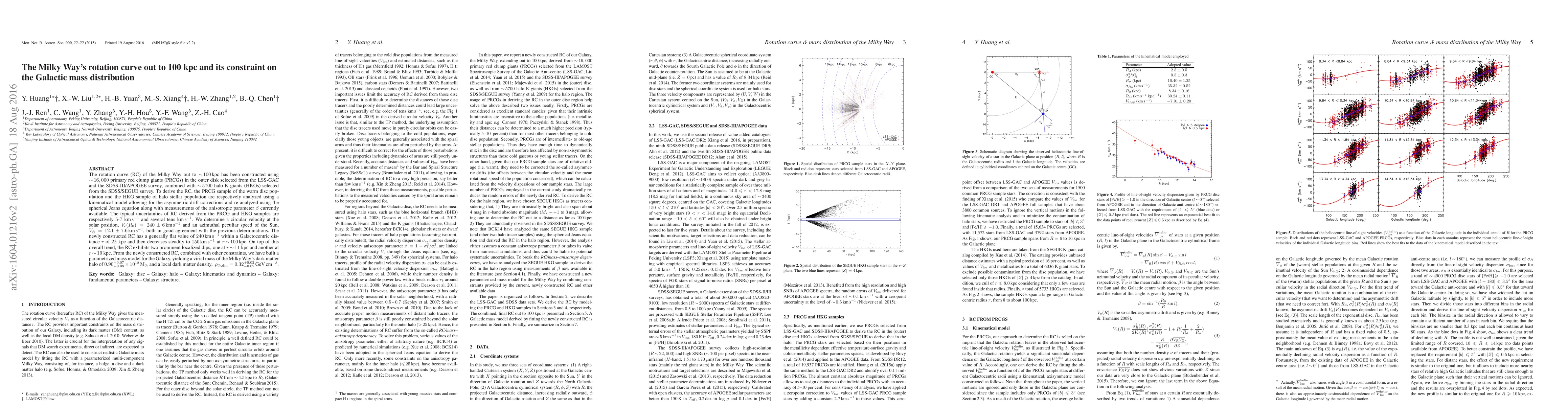 The research paper constructs the Milky Way's rotation curve out to 100 kpc using 16,000 red clump giants and 5700 halo K giants, finding a flat circular velocity of 240 km/s within 25 kpc, decreasing to 150 km/s at 100 kpc, with dips at 11 kpc and 19 kpc. Based on this, a mass model is developed, estimating the dark matter halo virial mass at 0.90×10^12 ${ m M}_{odot}$ and local dark matter density at 0.32 GeV cm$^{-3}$.