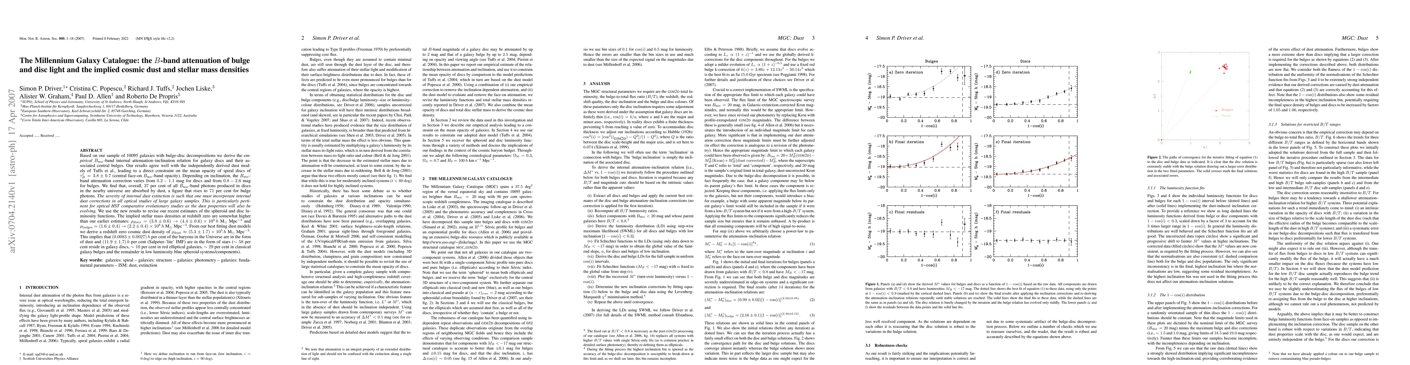 This paper analyzes the B-band attenuation in galaxies, finding that 37% of disc photons and 71% of bulge photons are absorbed by dust. It estimates a cosmic dust density of (5.3 +/- 1.7) x 10^5 h M_{odot} Mpc^-3, implying ~0.83% of baryons are in dust and ~11.9% in stars, with most stars residing in discs.