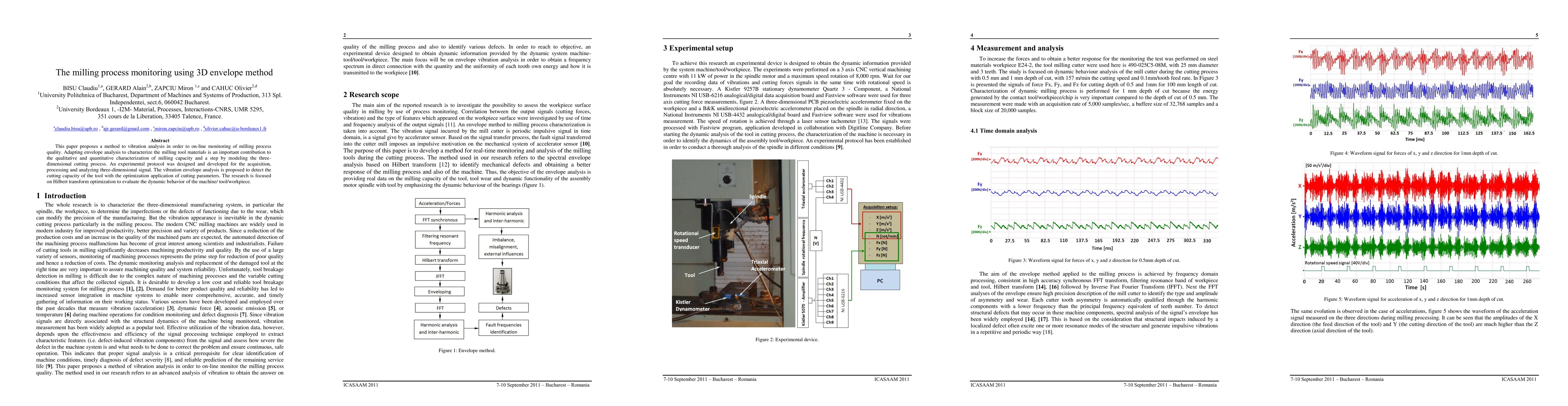 This paper proposes a method to monitor milling process quality using vibration analysis and 3D envelope method, aiming to optimize cutting parameters for better tool performance.