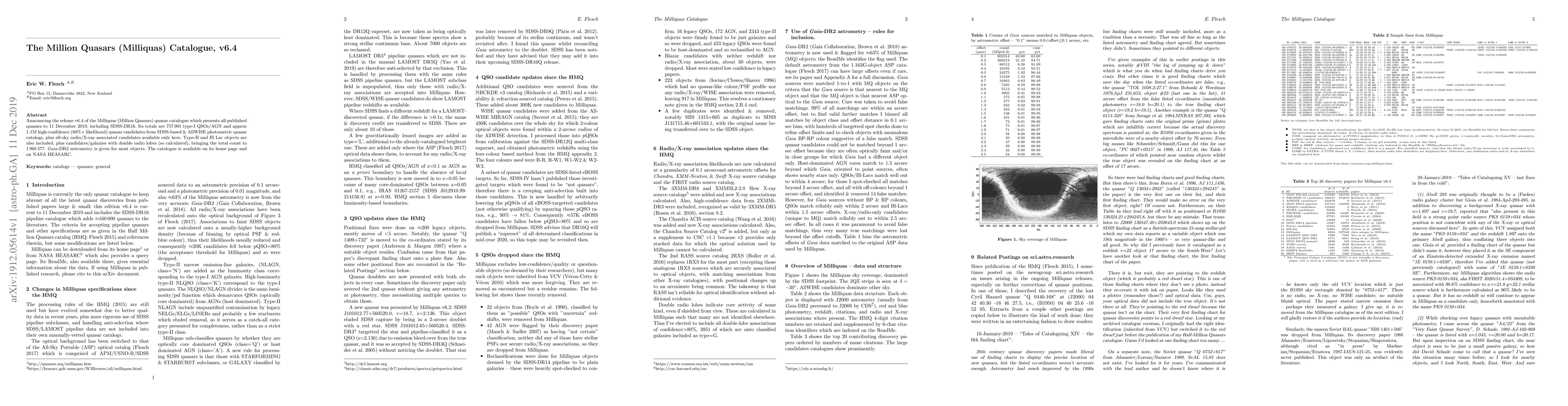 The Milliquas v6.4 catalogue presents an extensive compilation of quasars and AGN, totaling 757,991 type-I QSOs and approximately 1.1 million high-confidence quasar candidates, along with radio/X-ray associated objects, bringing the total to 1,968,377 entries. Gaia-DR2 astrometry is provided for most objects, and the catalogue is accessible via its homepage and NASA HEASARC.