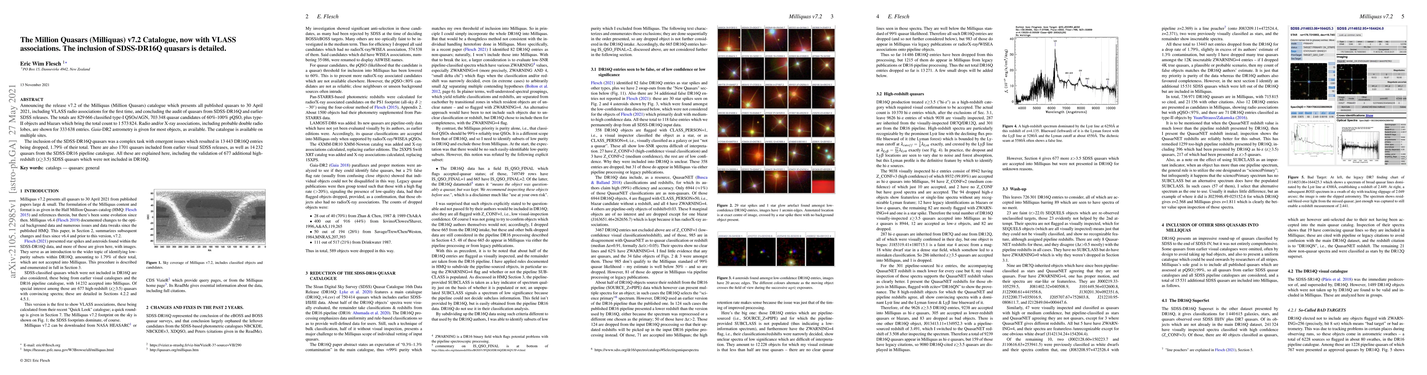 The Milliquas v7.2 catalogue now includes VLASS radio associations and concludes the audit of SDSS-DR16Q quasars, totaling 1,573,824 quasars and AGN, with 333,638 entries having radio or X-ray associations. The inclusion of SDSS-DR16Q quasars, though complex, resulted in 13,443 entries being dropped.