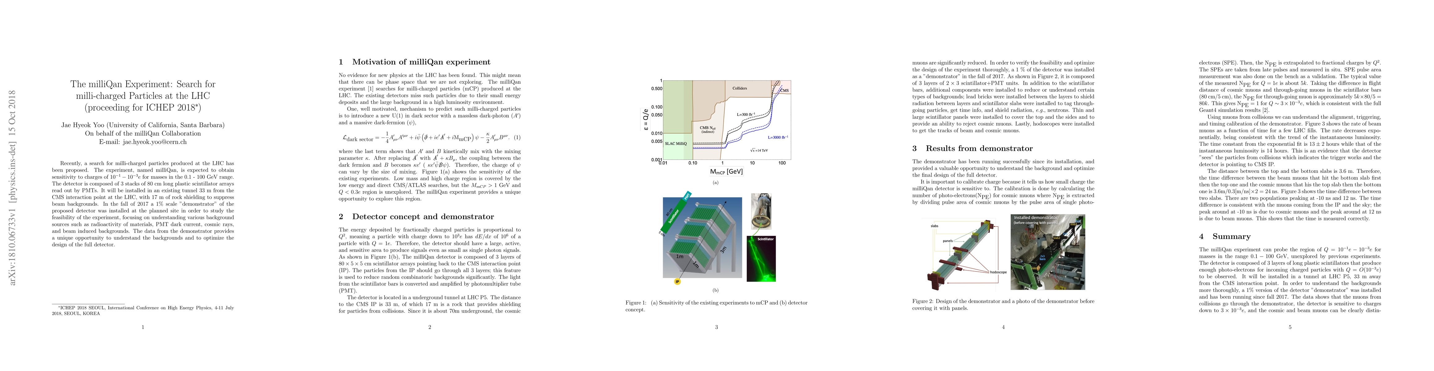 Researchers have proposed a new experiment called milliQan to search for particles with extremely small charges at the Large Hadron Collider, aiming to detect particles with $10^{-1} - 10^{-3}e$ charge. The experiment will utilize a detector composed of plastic scintillator arrays and PMTs to study background sources and optimize its design.