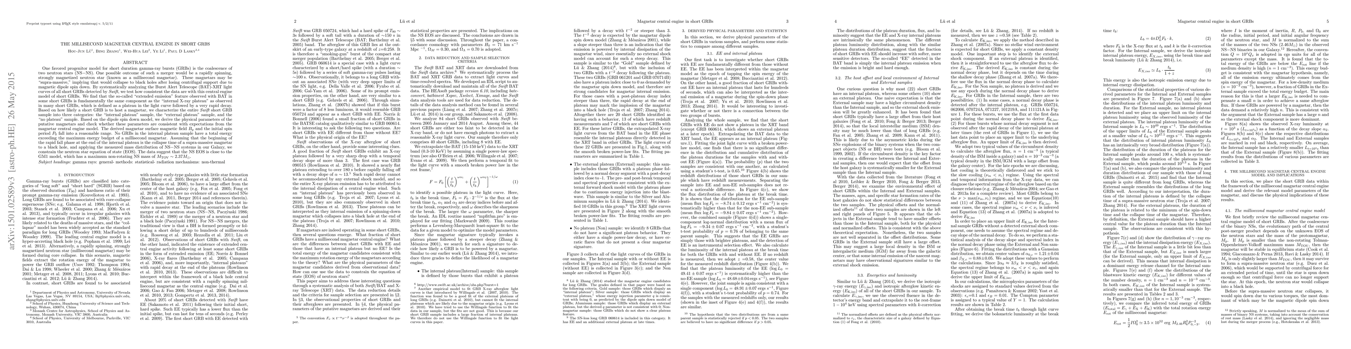 This research investigates the millisecond magnetar central engine model for short gamma-ray bursts (SGRBs), suggesting that the "extended emission" and "internal X-ray plateau" in SGRB light curves are manifestations of a rapidly spinning, magnetized neutron star. The study categorizes SGRBs based on the presence of these plateaus and constrains the neutron star equation of state, finding it aligns closely with the GM1 model, indicating a maximum non-rotating neutron star mass of approximately 2.37 solar masses.