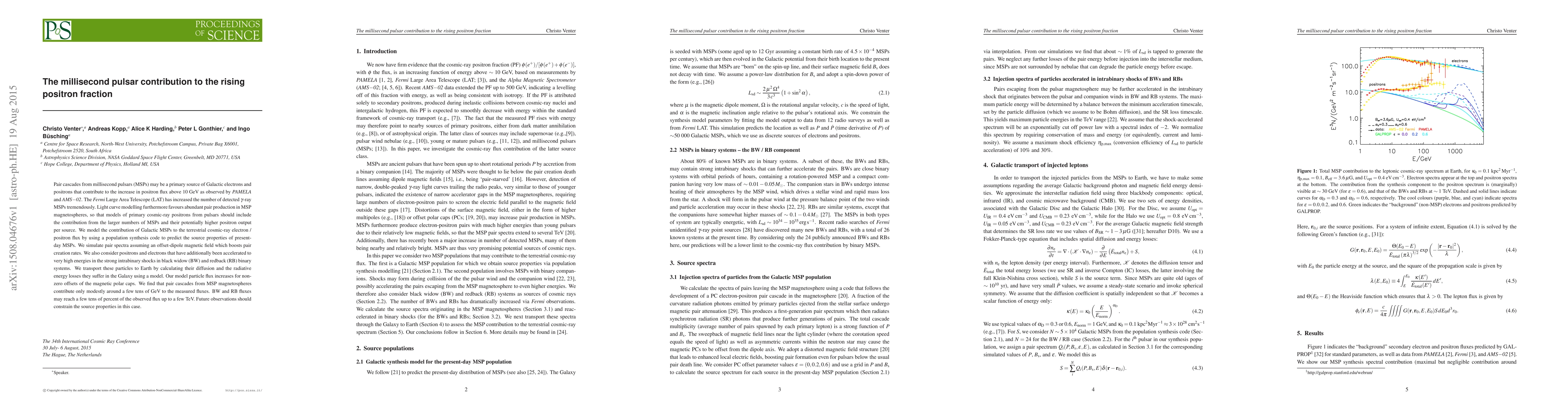 Pair cascades from millisecond pulsars (MSPs) may be a primary source of Galactic electrons and positrons that contribute to the increase in positron flux above 10 GeV as observed by PAMELA and AMS-02. The Fermi Large Area Telescope (LAT) has increased the number of detected gamma-ray MSPs tremendously. Light curve modelling furthermore favours abundant pair production in MSP magnetospheres, so that models of primary cosmic-ray positrons from pulsars should include the contribution from the larger numbers of MSPs and their potentially higher positron output per source. We model the contribution of Galactic MSPs to the terrestrial cosmic-ray electron / positron flux by using a population synthesis code to predict the source properties of present-day MSPs. We simulate pair spectra assuming an offset-dipole magnetic field which boosts pair creation rates. We also consider positrons and electrons that have additionally been accelerated to very high energies in the strong intrabinary shocks in black widow (BW) and redback (RB) binary systems. We transport these particles to Earth by calculating their diffusion and the radiative energy losses they suffer in the Galaxy using a model. Our model particle flux increases for non-zero offsets of the magnetic polar caps. We find that pair cascades from MSP magnetospheres contribute only modestly around a few tens of GeV to the measured fluxes. BW and RB fluxes may reach a few tens of percent of the observed flux up to a few TeV. Future observations should constrain the source properties in this case.