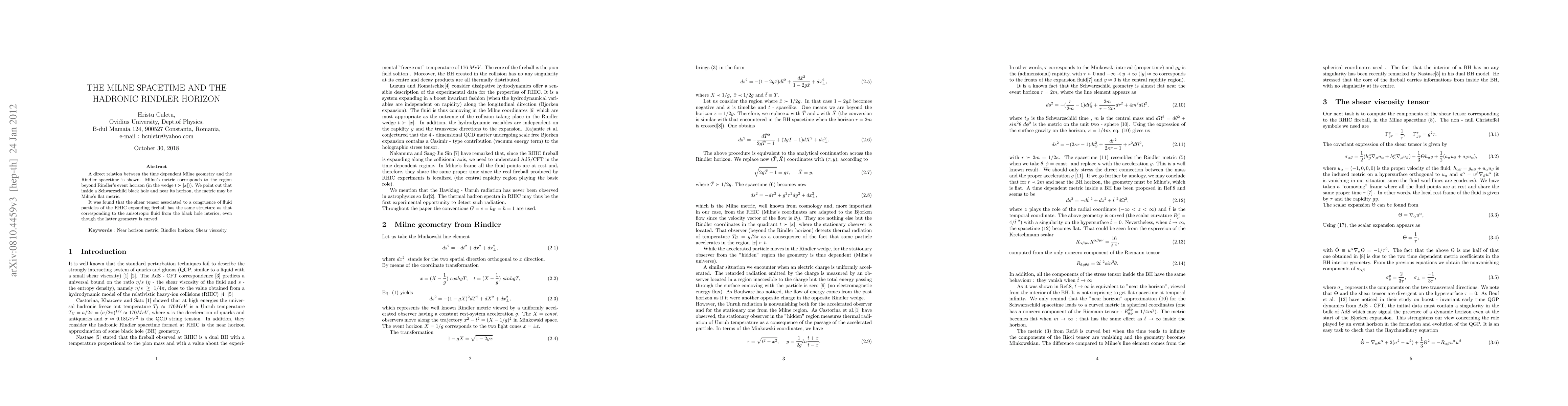 This paper establishes a connection between Milne spacetime and Rindler horizon, showing that Milne's metric describes the region beyond Rindler's event horizon. It also reveals that the shear tensor from the RHIC expanding fireball mirrors the anisotropic fluid structure within the curved black hole interior.