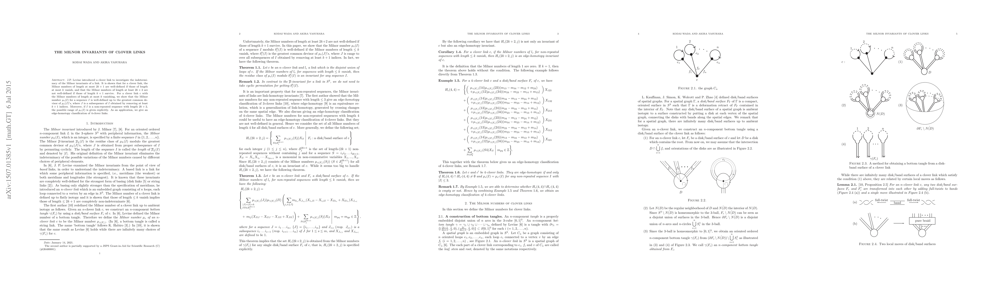 J.P. Levine introduced a clover link to investigate the indeterminacy of the Milnor invariants of a link. It is shown that for a clover link, the Milnor numbers of length at most $2k+1$ are well-defined if those of length at most $k$ vanish, and that the Milnor numbers of length at least $2k+2$ are not well-defined if those of length $k+1$ survive. For a clover link $c$ with the Milnor numbers of length at most $k$ vanishing, we show that the Milnor number $\mu_c(I)$ for a sequence $I$ is well-defined up to the greatest common devisor of $\mu_{c}(J)'s$, where $J$ is a subsequence of $I$ obtained by removing at least $k+1$ indices. Moreover, if $I$ is a non-repeated sequence with length $2k+2$, the possible range of $\mu_c(I)$ is given explicitly. As an application, we give an edge-homotopy classification of $4$-clover links.