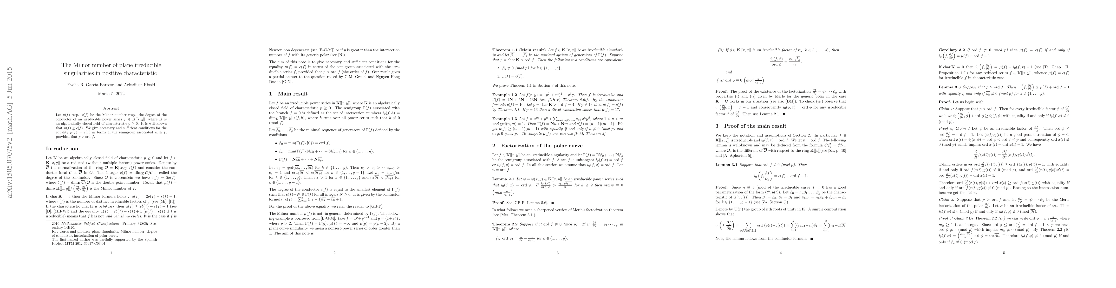 \noindent Let $\mu(f)$ resp. $c(f)$ be the Milnor number resp. the degree of the conductor of an irreducible power series $f\in \bK[[x,y]]$, where $\bK$ is an algebraically closed field of characteristic $p\geq 0$. It is well-known that $\mu(f)\geq c(f)$. We give necessary and sufficient conditions for the equality $\mu(f)=c(f)$ in terms of the semigroup associated with $f$, provided that $p>\ord f$.