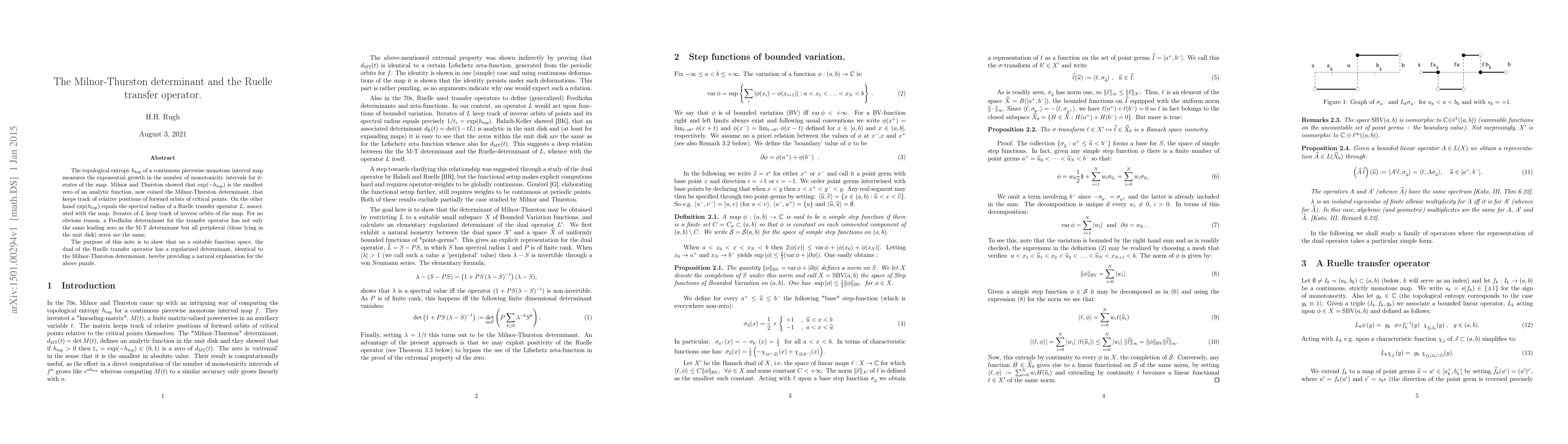 The topological entropy $h_{\rm top}$ of a continuous piecewise monotone interval map measures the exponential growth in the number of monotonicity intervals for iterates of the map. Milnor and Thurston showed that $\exp(-h_{\rm top})$ is the smallest zero of an analytic function, now coined the Milnor-Thurston determinant, that keeps track of relative positions of forward orbits of critical points. On the other hand $\exp(h_{\rm top})$ equals the spectral radius of a Ruelle transfer operator $L$, associated with the map. Iterates of $L$ keep track of inverse orbits of the map. For no obvious reason, a Fredholm determinant for the transfer operator has not only the same leading zero as the M-T determinant but all peripheral (those lying in the unit disk) zeros are the same. The purpose of this note is to show that on a suitable function space, the dual of the Ruelle transfer operator has a regularized determinant, identical to the Milnor-Thurston determinant, hereby providing a natural explanation for the above puzzle.