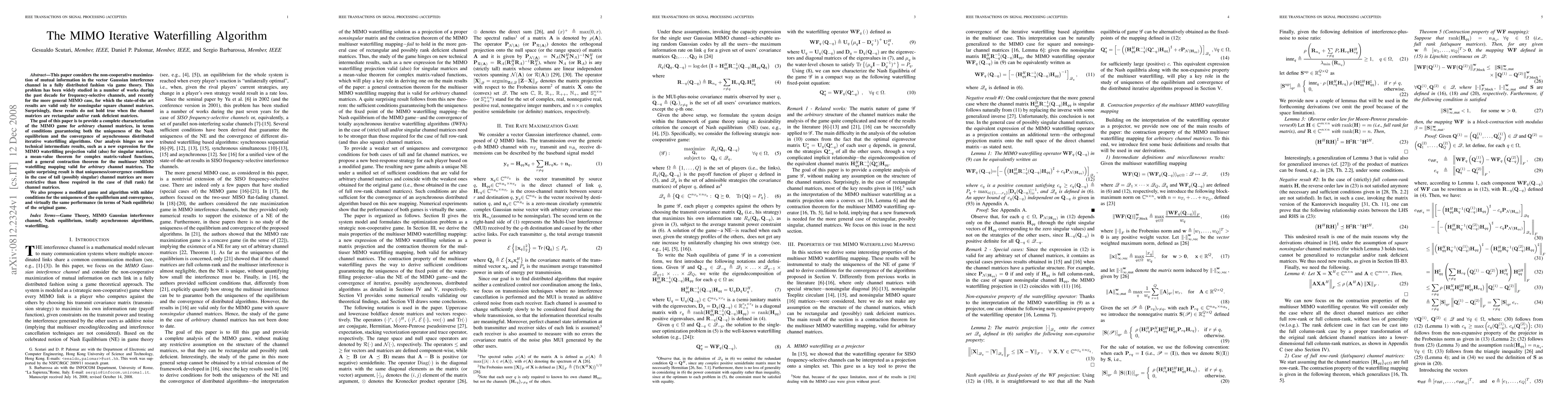 This paper develops a MIMO iterative waterfilling algorithm to maximize mutual information in distributed vector Gaussian interference channels, addressing challenges for non-square and rank-deficient matrices. It introduces new technical results and proposes a modified game with less restrictive conditions for convergence and equilibrium uniqueness while maintaining performance.