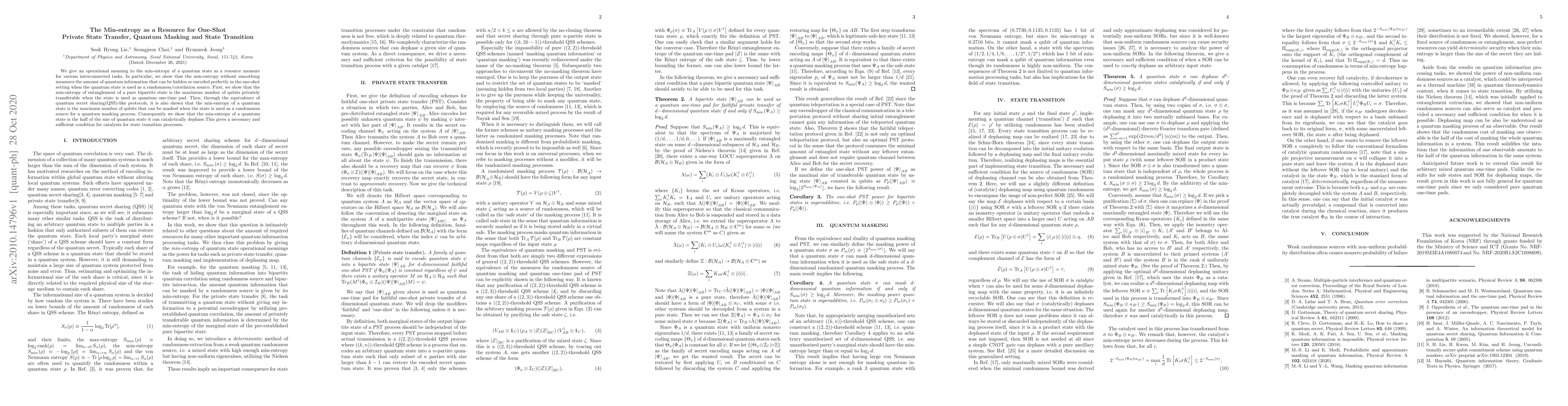We give an operational meaning to the min-entropy of a quantum state as a resource measure for various interconnected tasks. In particular, we show that the min-entropy without smoothing measures the amount of quantum information that can be hidden or encoded perfectly in the one-shot setting when the quantum state is used as a randomness/correlation source. First, we show that the min-entropy of entanglement of a pure bipartite state is the maximum number of qubits privately transferable when the state is used as quantum one-time pad. Then, through the equivalence of quantum secret sharing(QSS)-like protocols, it is also shown that the min-entropy of a quantum state is the maximum number of qubits that can be masked when the state is used as a randomness source for a quantum masking process. Consequently we show that the min-entropy of a quantum state is the half of the size of quantum state it can catalytically dephase.This gives a necessary and sufficient condition for catalysts for state transition processes.