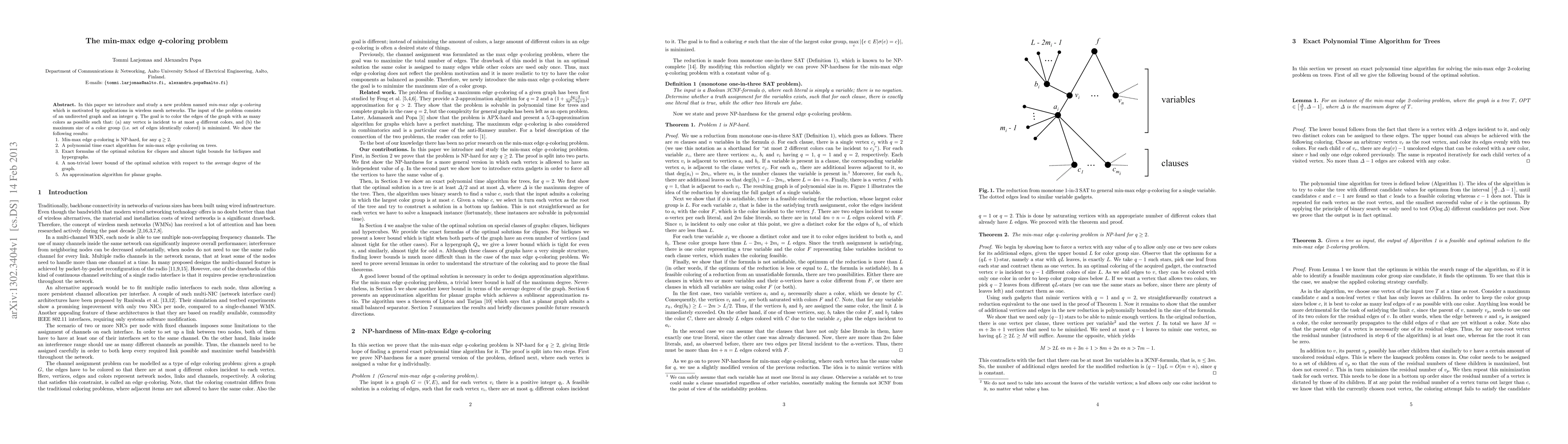 In this paper we introduce and study a new problem named \emph{min-max edge $q$-coloring} which is motivated by applications in wireless mesh networks. The input of the problem consists of an undirected graph and an integer $q$. The goal is to color the edges of the graph with as many colors as possible such that: (a) any vertex is incident to at most $q$ different colors, and (b) the maximum size of a color group (i.e. set of edges identically colored) is minimized. We show the following results: 1. Min-max edge $q$-coloring is NP-hard, for any $q \ge 2$. 2. A polynomial time exact algorithm for min-max edge $q$-coloring on trees. 3. Exact formulas of the optimal solution for cliques and almost tight bounds for bicliques and hypergraphs. 4. A non-trivial lower bound of the optimal solution with respect to the average degree of the graph. 5. An approximation algorithm for planar graphs.