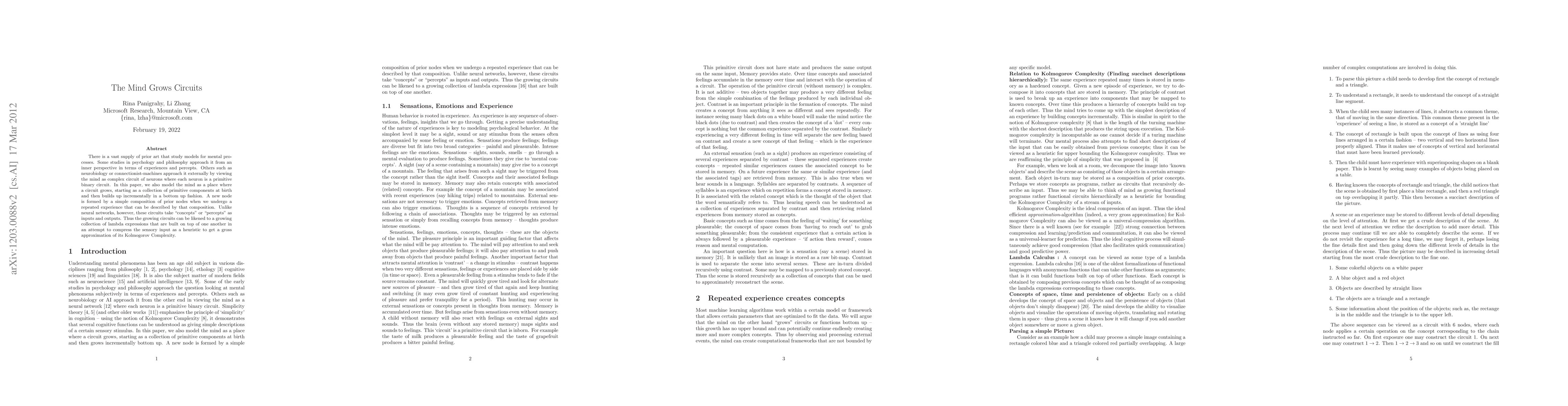 There is a vast supply of prior art that study models for mental processes. Some studies in psychology and philosophy approach it from an inner perspective in terms of experiences and percepts. Others such as neurobiology or connectionist-machines approach it externally by viewing the mind as complex circuit of neurons where each neuron is a primitive binary circuit. In this paper, we also model the mind as a place where a circuit grows, starting as a collection of primitive components at birth and then builds up incrementally in a bottom up fashion. A new node is formed by a simple composition of prior nodes when we undergo a repeated experience that can be described by that composition. Unlike neural networks, however, these circuits take "concepts" or "percepts" as inputs and outputs. Thus the growing circuits can be likened to a growing collection of lambda expressions that are built on top of one another in an attempt to compress the sensory input as a heuristic to bound its Kolmogorov Complexity.