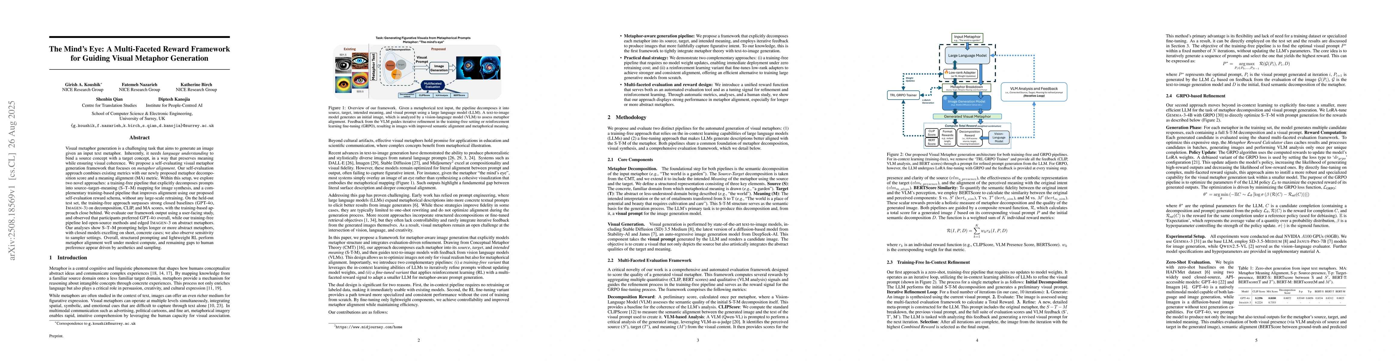 Visual metaphor generation is a challenging task that aims to generate an image given an input text metaphor. Inherently, it needs language understanding to bind a source concept with a target concept, in a way that preserves meaning while ensuring visual coherence. We propose a self-evaluating visual metaphor generation framework that focuses on metaphor alignment. Our self-evaluation approach combines existing metrics with our newly proposed metaphor decomposition score and a meaning alignment (MA) metric. Within this setup, we explore two novel approaches: a training-free pipeline that explicitly decomposes prompts into source-target-meaning (S-T-M) mapping for image synthesis, and a complementary training-based pipeline that improves alignment using our proposed self-evaluation reward schema, without any large-scale retraining. On the held-out test set, the training-free approach surpasses strong closed baselines (GPT-4o, Imagen) on decomposition, CLIP, and MA scores, with the training-based approach close behind. We evaluate our framework output using a user-facing study, and observed that participants preferred GPT-4o overall, while our training-free pipeline led open-source methods and edged Imagen on abstract metaphors. Our analyses show S-T-M prompting helps longer or more abstract metaphors, with closed models excelling on short, concrete cases; we also observe sensitivity to sampler settings. Overall, structured prompting and lightweight RL perform metaphor alignment well under modest compute, and remaining gaps to human preference appear driven by aesthetics and sampling.