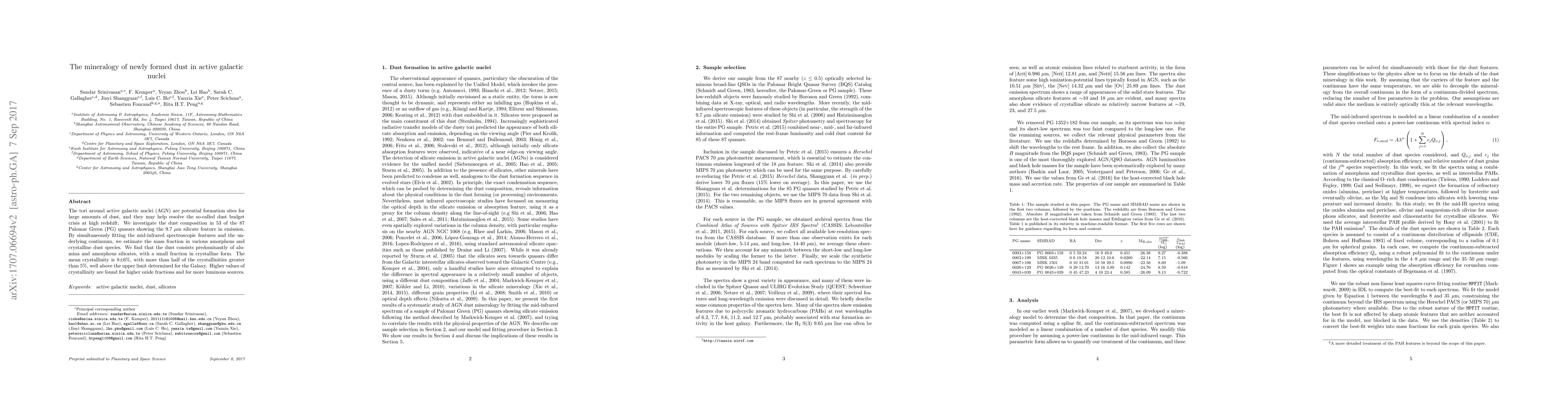 The tori around active galactic nuclei (AGN) are potential formation sites for large amounts of dust, and they may help resolve the so-called dust budget crisis at high redshift. We investigate the dust composition in 53 of the 87 Palomar Green (PG) quasars showing the 9.7 micron silicate feature in emission. By simultaneously fitting the mid-infrared spectroscopic features and the underlying continuum, we estimate the mass fraction in various amorphous and crystalline dust species. We find that the dust consists predominantly of alumina and amorphous silicates, with a small fraction in crystalline form. The mean crystallinity is 8 +/- 6%, with more than half of the crystallinities greater than 5%, well above the upper limit determined for the Galaxy. Higher values of crystallinity are found for higher oxide fractions and for more luminous sources.