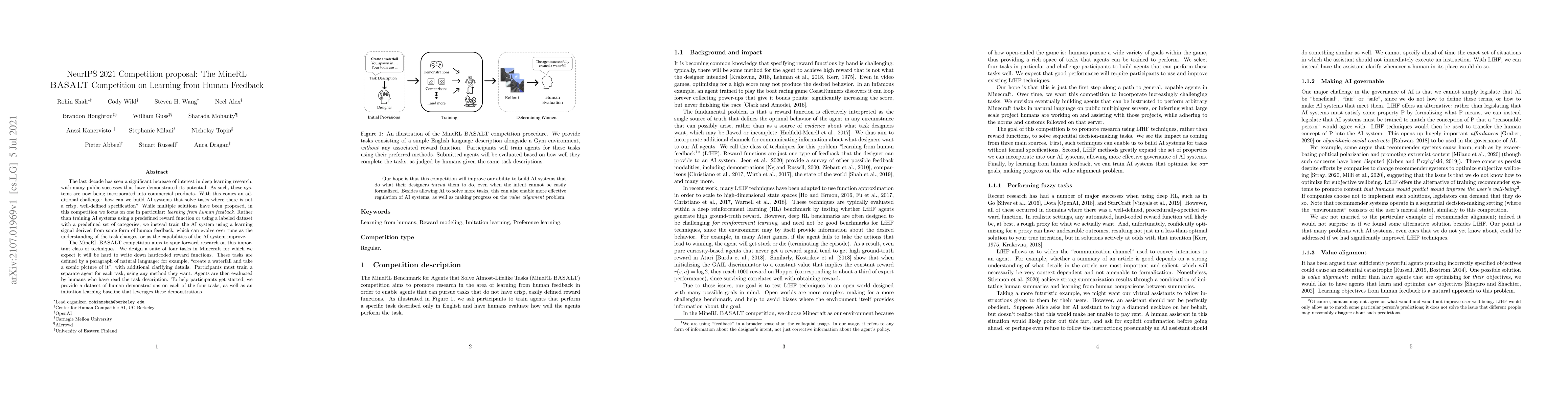 The last decade has seen a significant increase of interest in deep learning research, with many public successes that have demonstrated its potential. As such, these systems are now being incorporated into commercial products. With this comes an additional challenge: how can we build AI systems that solve tasks where there is not a crisp, well-defined specification? While multiple solutions have been proposed, in this competition we focus on one in particular: learning from human feedback. Rather than training AI systems using a predefined reward function or using a labeled dataset with a predefined set of categories, we instead train the AI system using a learning signal derived from some form of human feedback, which can evolve over time as the understanding of the task changes, or as the capabilities of the AI system improve. The MineRL BASALT competition aims to spur forward research on this important class of techniques. We design a suite of four tasks in Minecraft for which we expect it will be hard to write down hardcoded reward functions. These tasks are defined by a paragraph of natural language: for example, "create a waterfall and take a scenic picture of it", with additional clarifying details. Participants must train a separate agent for each task, using any method they want. Agents are then evaluated by humans who have read the task description. To help participants get started, we provide a dataset of human demonstrations on each of the four tasks, as well as an imitation learning baseline that leverages these demonstrations. Our hope is that this competition will improve our ability to build AI systems that do what their designers intend them to do, even when the intent cannot be easily formalized. Besides allowing AI to solve more tasks, this can also enable more effective regulation of AI systems, as well as making progress on the value alignment problem.