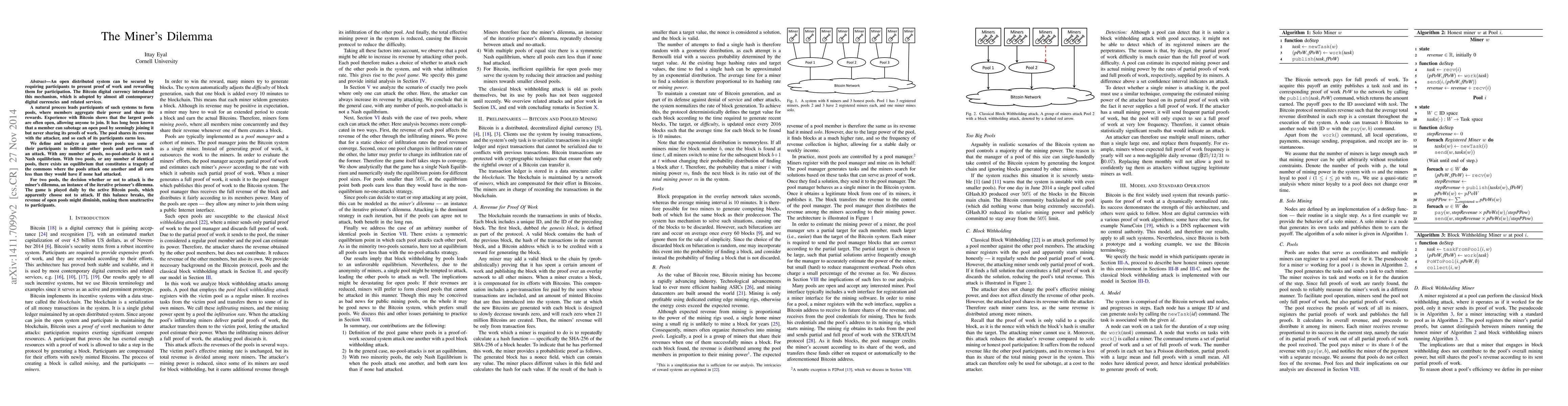 Researchers analyzed a game where Bitcoin pools attack each other, finding that even with no-pool-attacks as a Nash equilibrium, the pools still choose not to attack due to the 'miner's dilemma', potentially threatening the security of open pools.