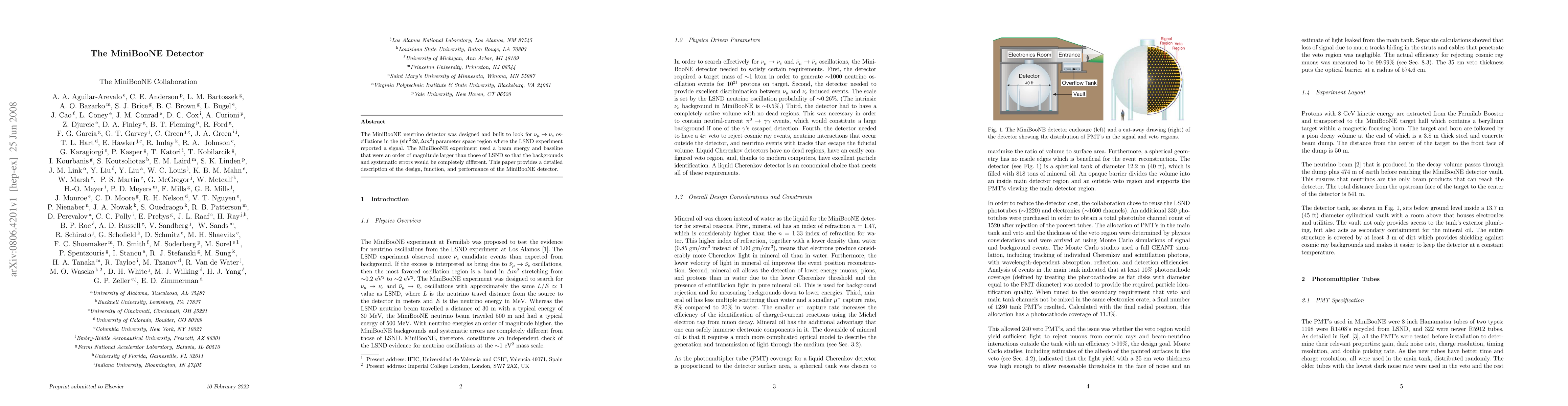 The MiniBooNE detector paper details the design, operation, and performance of a neutrino detector aiming to confirm or refute muon-neutrino to electron-neutrino oscillation signals first hinted at by the LSND experiment. The MiniBooNE detector, with larger beam energy and baseline, was intended to have distinct backgrounds and systematic errors.