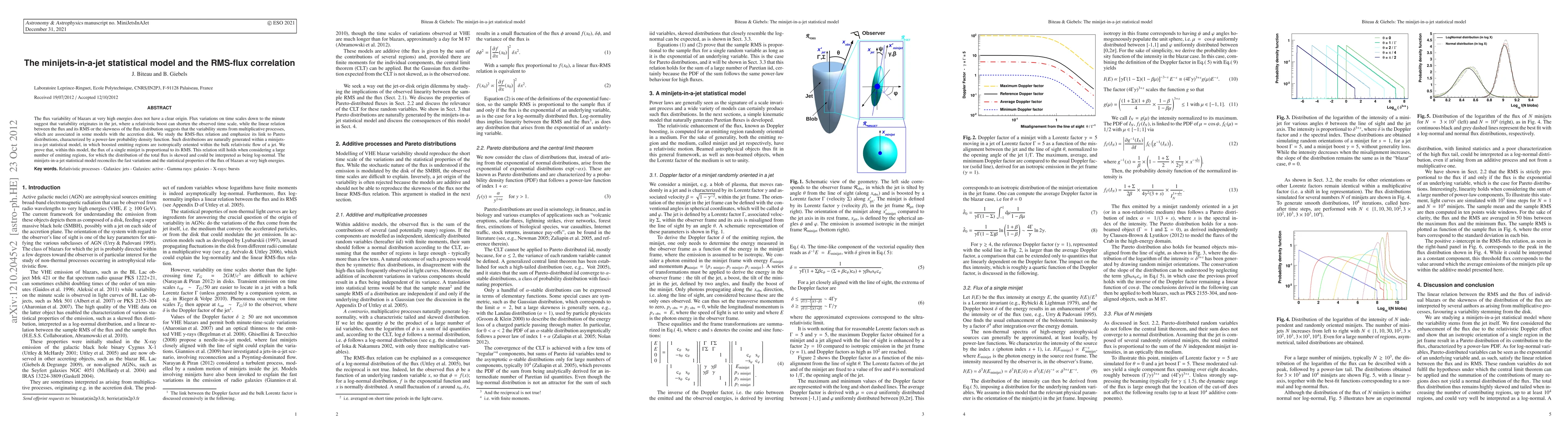 The minijets-in-a-jet statistical model explains high-energy blazar flux variability through relativistic boosting of emitting regions, linking fast variations to multiplicative processes.