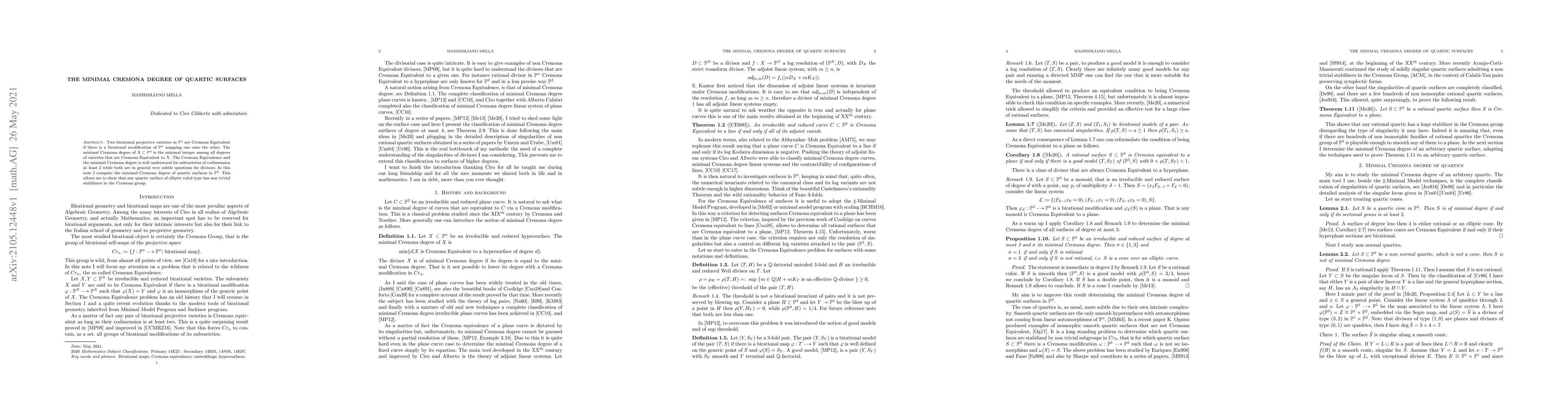 This paper computes the minimal Cremona degree of quartic surfaces in projective 3-space, demonstrating that quartic surfaces of elliptic ruled type possess nontrivial stabilizers in the Cremona group. The study highlights the complexity of Cremona equivalence for lower-dimensional subvarieties compared to higher codimensions.