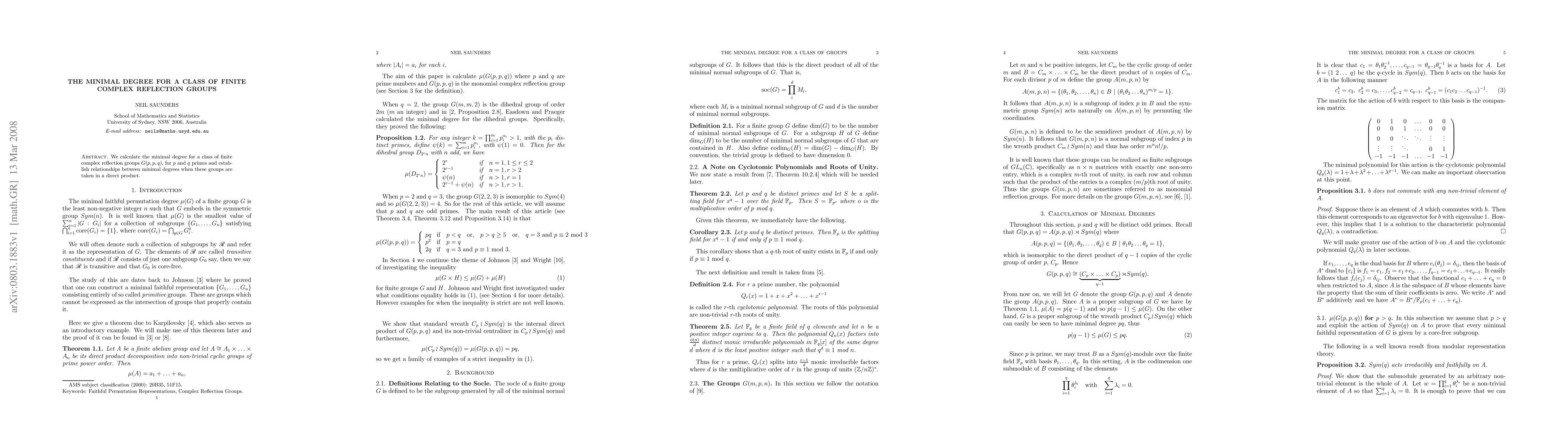 We calculate the minimal degree for a class of finite complex reflection groups $G(p,p,q)$, for $p$ and $q$ primes and establish relationships between minimal degrees when these groups are taken in a direct product.