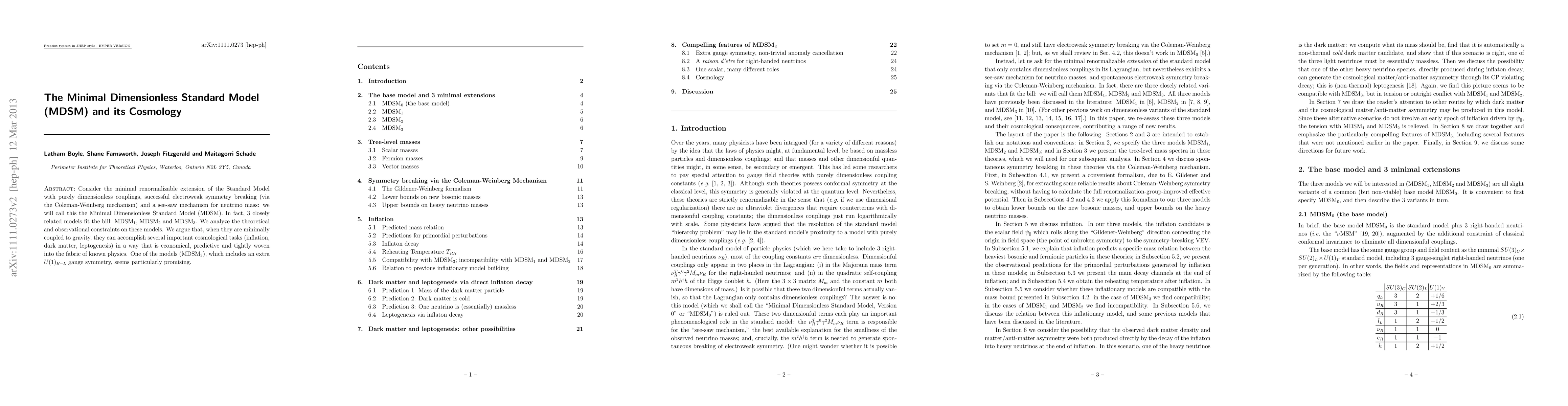 Consider the minimal renormalizable extension of the Standard Model with purely dimensionless couplings, successful electroweak symmetry breaking (via the Coleman-Weinberg mechanism) and a see-saw mechanism for neutrino mass: we will call this the Minimal Dimensionless Standard Model (MDSM). In fact, 3 closely related models fit the bill: MDSM_1, MDSM_2 and MDSM_3. We analyze the theoretical and observational constraints on these models. We argue that, when they are minimally coupled to gravity, they can accomplish several important cosmological tasks (inflation, dark matter, leptogenesis) in a way that is economical, predictive and tightly woven into the fabric of known physics. One of the models (MDSM_3), which includes an extra U(1)_{B-L} gauge symmetry, seems particularly promising.
