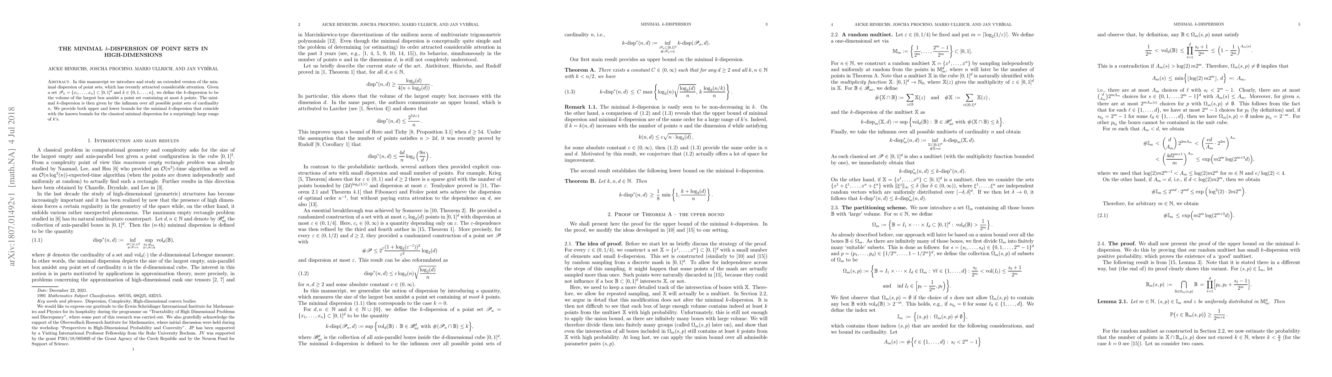 This paper introduces the concept of minimal $k$-dispersion for point sets in high-dimensional spaces, defining it as the volume of the largest box containing at most $k$ points. It provides upper and lower bounds for this dispersion that align with classical minimal dispersion bounds for a broad range of $k$ values.