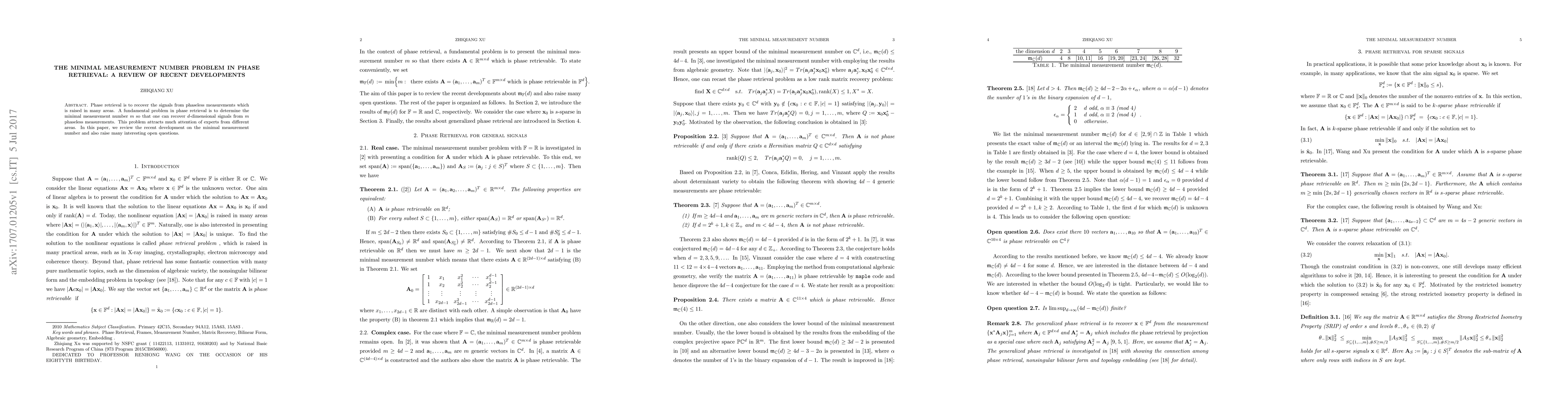 A review of recent developments in phase retrieval research explores the minimal measurement number problem, which seeks to determine how many phaseless measurements are needed to recover d-dimensional signals. The study raises several open questions while highlighting key findings.