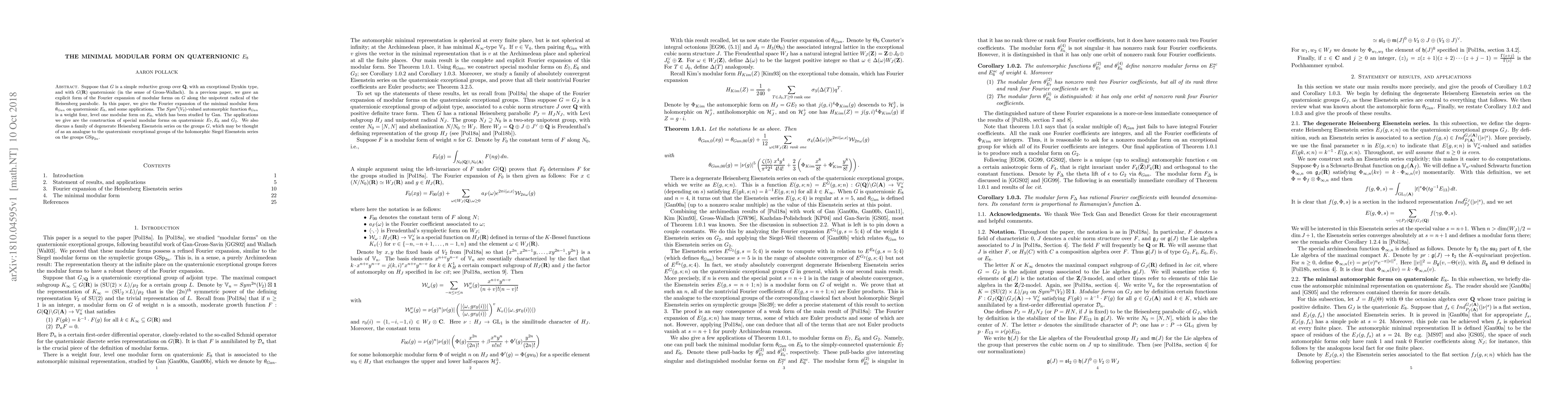 Suppose that $G$ is a simple reductive group over $\mathbf{Q}$, with an exceptional Dynkin type, and with $G(\mathbf{R})$ quaternionic (in the sense of Gross-Wallach). In a previous paper, we gave an explicit form of the Fourier expansion of modular forms on $G$ along the unipotent radical of the Heisenberg parabolic. In this paper, we give the Fourier expansion of the minimal modular form $\theta_{Gan}$ on quaternionic $E_8$, and some applications. The $Sym^{8}(V_2)$-valued automorphic function $\theta_{Gan}$ is a weight four, level one modular form on $E_8$, which has been studied by Gan. The applications we give are the construction of special modular forms on quaternionic $E_7, E_6$ and $G_2$. We also discuss a family of degenerate Heisenberg Eisenstein series on the groups $G$, which may be thought of as an analogue to the quaternionic exceptional groups of the holomorphic Siegel Eisenstein series on the groups $\mathrm{GSp}_{2n}$.
