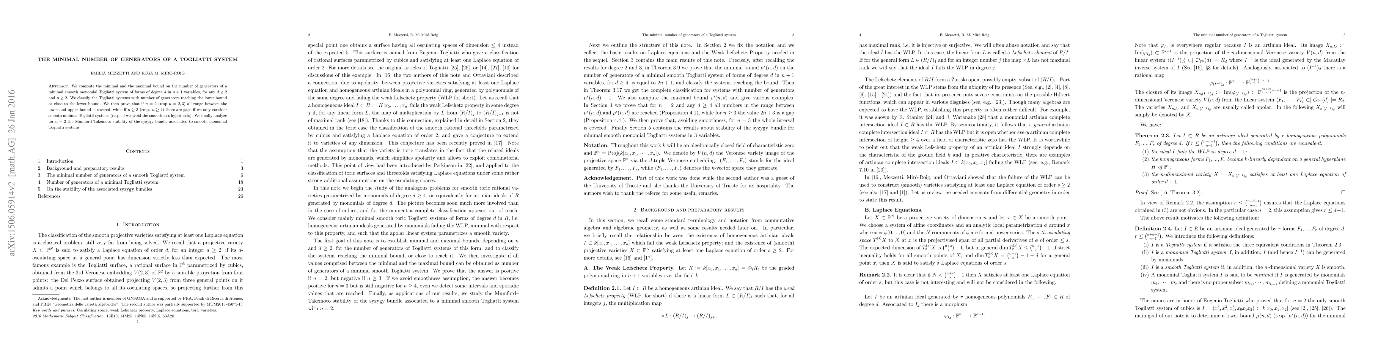 We compute the minimal and the maximal bound on the number of generators of a minimal smooth monomial Togliatti system of forms of degree $d$ in $n+1$ variables, for any $d\ge 2$ and $n\geq 2$. We classify the Togliatti systems with number of generators reaching the lower bound or close to the lower bound. We then prove that if $n=2$ (resp $n=2,3$) all range between the lower and upper bound is covered, while if $n\geq 3$ (resp. $n\ge 4$) there are gaps if we only consider smooth minimal Togliatti systems (resp. if we avoid the smoothness hypothesis). We finally analyze for $n=2$ the Mumford-Takemoto stability of the syzygy bundle associated to smooth monomial Togliatti systems.