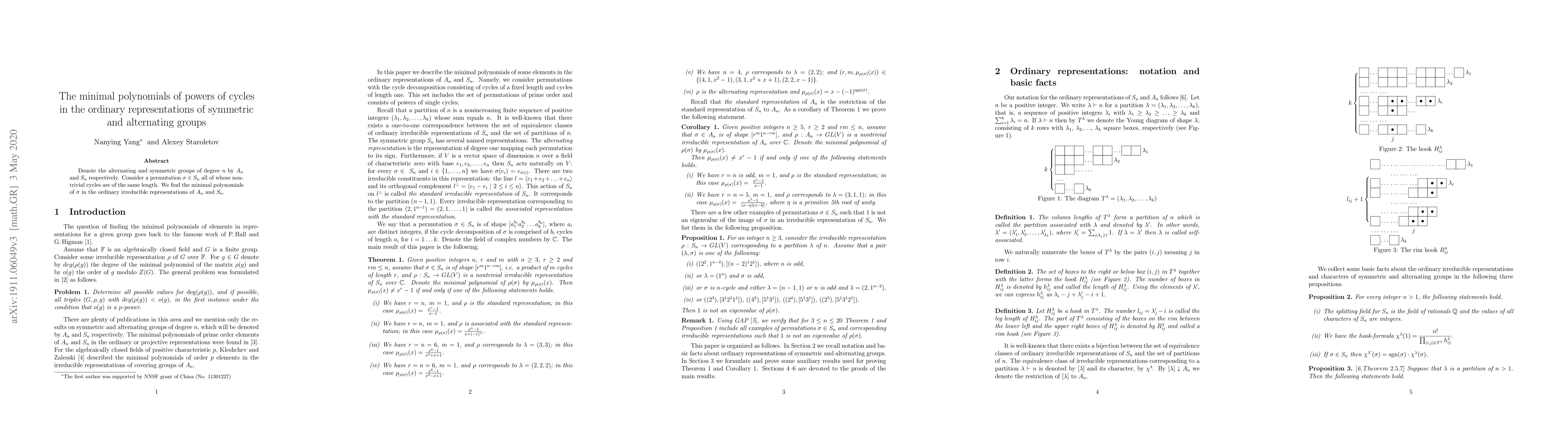 Denote the alternating and symmetric groups of degree $n$ by $A_n$ and $S_n$ respectively. Consider a permutation $\sigma\in S_n$ all of whose nontrivial cycles are of the same length. We find the minimal polynomials of $\sigma$ in the ordinary irreducible representations of $A_n$ and $S_n$.