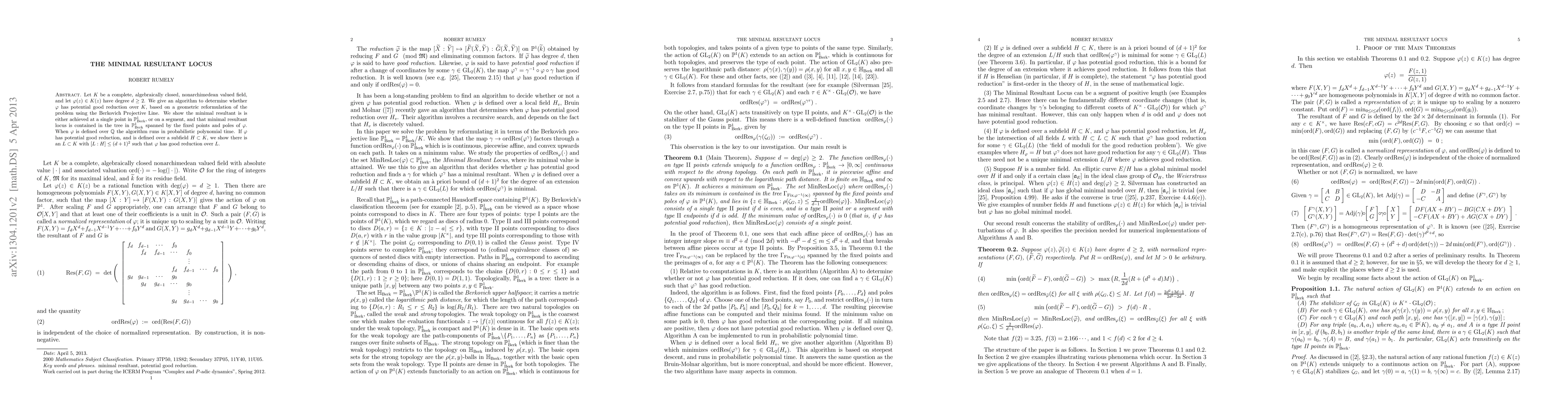 Let K be a complete, algebraically closed nonarchimedean valued field, and let f(z) in K(z) be a rational function of degree d at least 2. We give an algorithm to determine whether f(z) has potential good reduction over K, based on a geometric reformulation of the problem using the Berkovich Projective Line. We show the minimal resultant is is either achieved at a single point in the Berkovich line, or on a segment, and that minimal resultant locus is contained in the tree in spanned by the fixed points and the poles of f(z). When f(z) is defined over the rationals, the algorithm runs in probabilistic polynomial time. If f(z) has potential good reduction, and is defined over a subfield H of K, we show there is an extension L/H in K with degree at most (d + 1)^2 such that f(z) achieves good reduction over L.