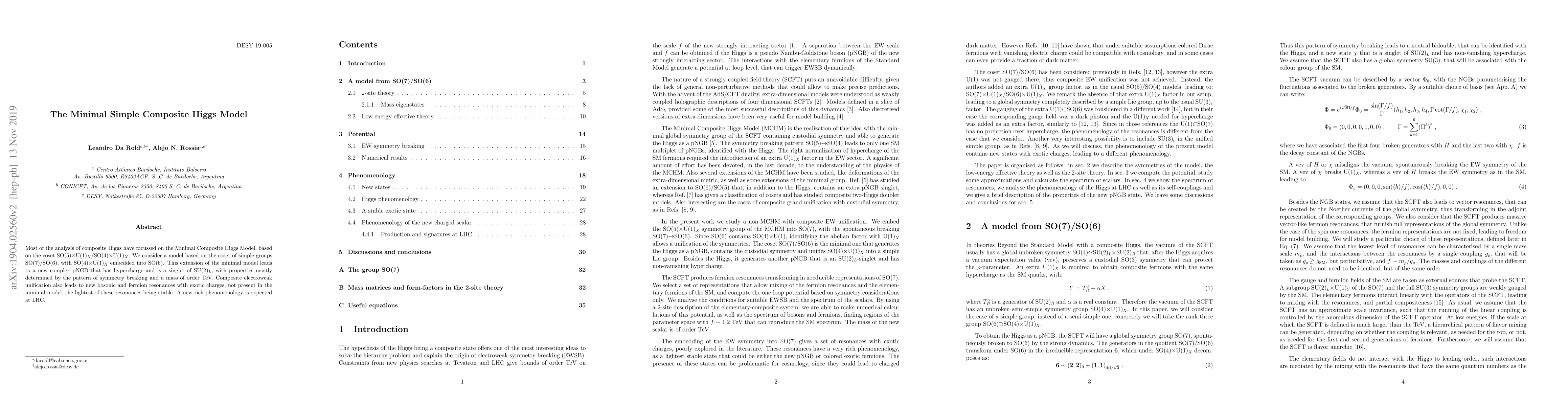 Most of the analysis of composite Higgs have focussed on the Minimal Composite Higgs Model, based on the coset SO(5)$\times$U(1)$_X$/SO(4)$\times$U(1)$_X$. We consider a model based on the coset of simple groups SO(7)/SO(6), with SO(4)$\times$U(1)$_X$ embedded into SO(6). This extension of the minimal model leads to a new complex pNGB that has hypercharge and is a singlet of SU(2)$_L$, with properties mostly determined by the pattern of symmetry breaking and a mass of order TeV. Composite electroweak unification also leads to new bosonic and fermion resonances with exotic charges, not present in the minimal model. The lightest of these resonances is stable, and in some cases could provide candidates for dark matter. A new rich phenomenology is expected at LHC.
