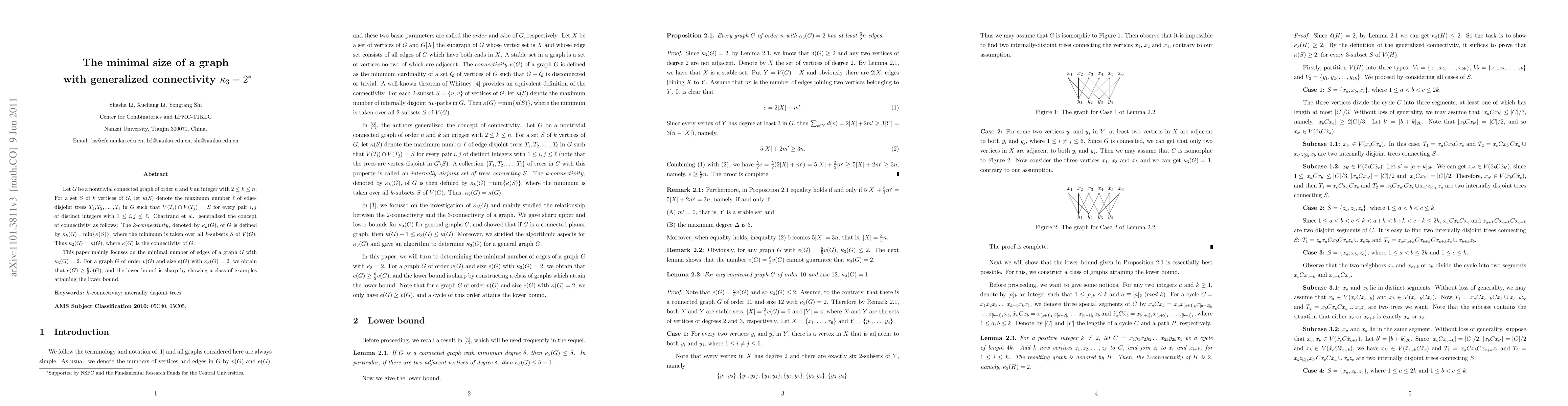 Let $G$ be a nontrivial connected graph of order $n$ and $k$ an integer with $2\leq k\leq n$. For a set $S$ of $k$ vertices of $G$, let $\kappa (S)$ denote the maximum number $\ell$ of edge-disjoint trees $T_1,T_2,...,T_\ell$ in $G$ such that $V(T_i)\cap V(T_j)=S$ for every pair $i,j$ of distinct integers with $1\leq i,j\leq \ell$. Chartrand et al. generalized the concept of connectivity as follows: The $k$-$connectivity$, denoted by $\kappa_k(G)$, of $G$ is defined by $\kappa_k(G)=$min$\{\kappa(S)\}$, where the minimum is taken over all $k$-subsets $S$ of $V(G)$. Thus $\kappa_2(G)=\kappa(G)$, where $\kappa(G)$ is the connectivity of $G$. This paper mainly focuses on the minimal number of edges of a graph $G$ with $\kappa_{3}(G)= 2$. For a graph $G$ of order $v(G)$ and size $e(G)$ with $\kappa_{3}(G)= 2$, we obtain that $e(G)\geq 6/5v(G)$, and the lower bound is sharp by showing a class of examples attaining the lower bound.